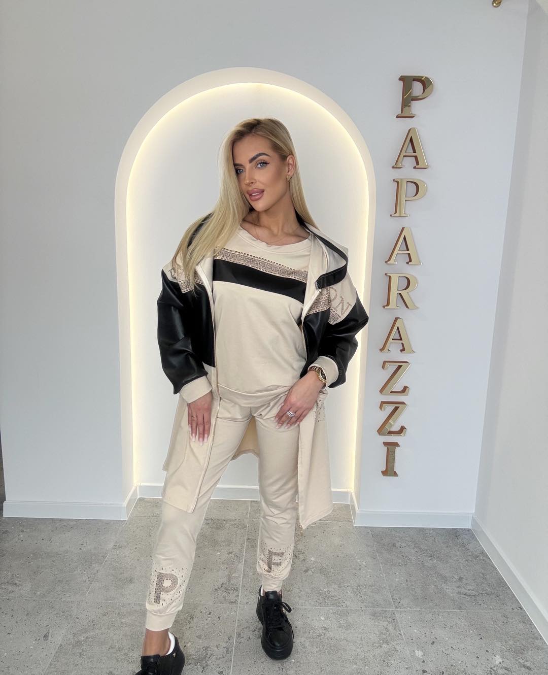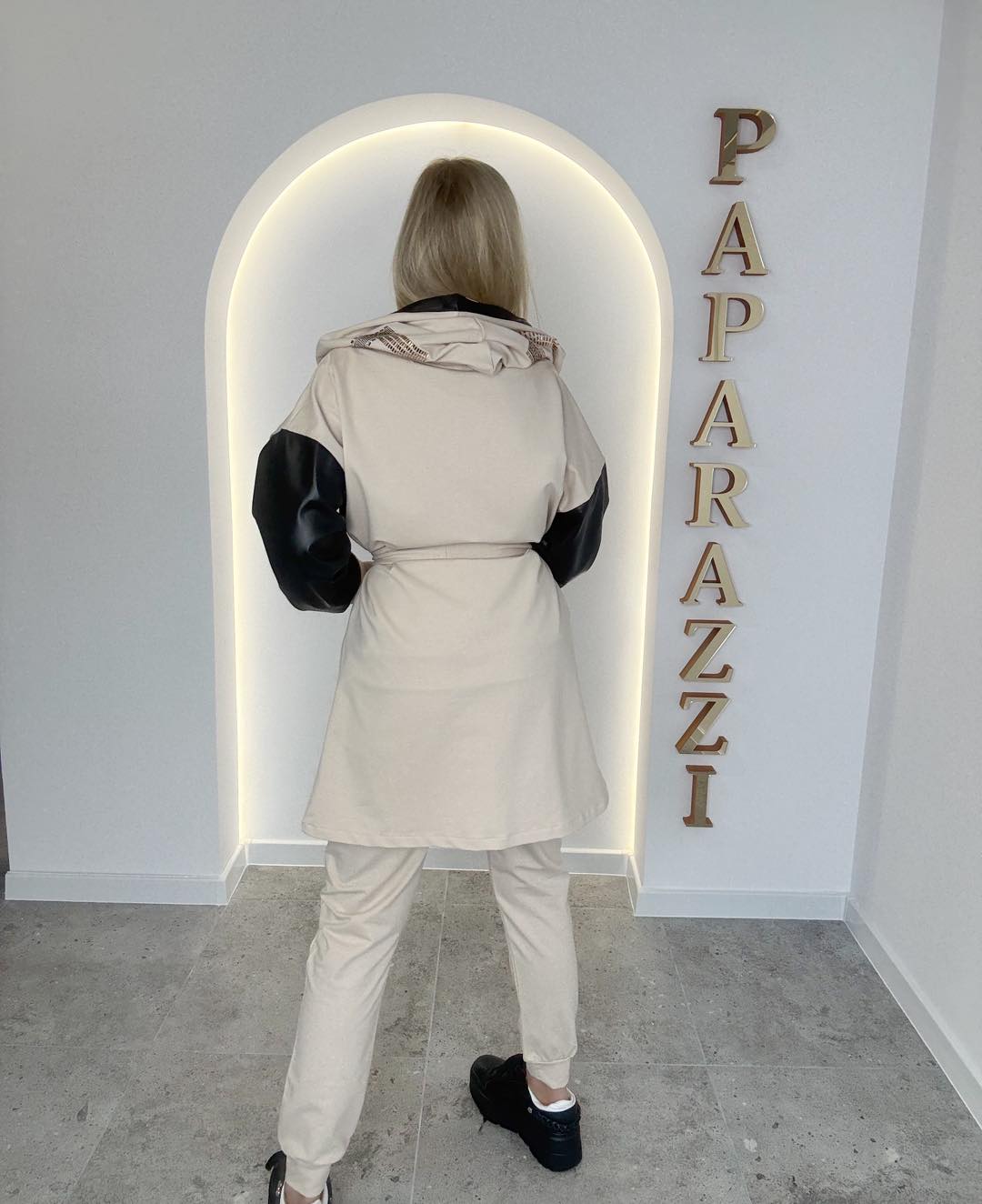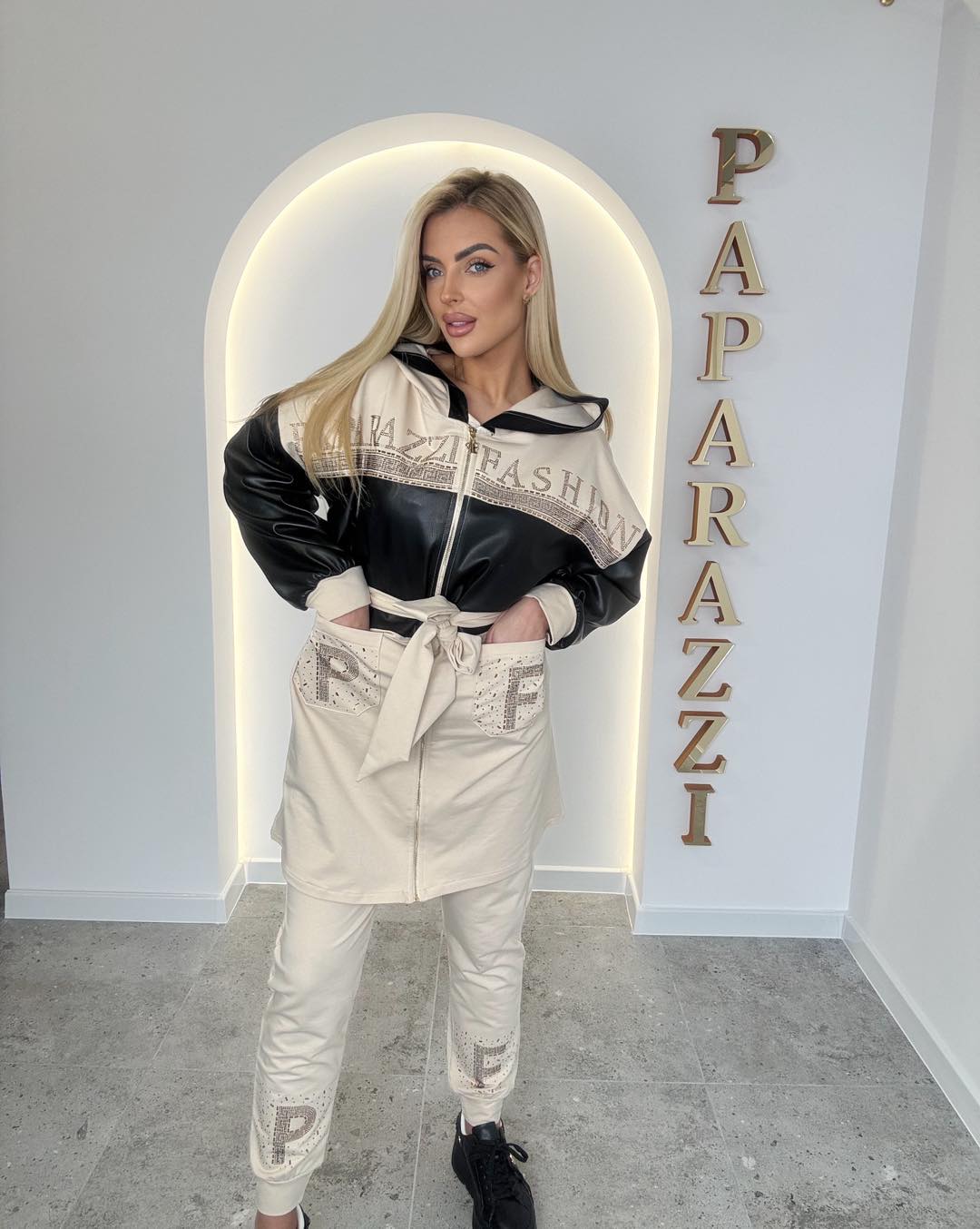 3-set z połączenia bawełny i ekoskóry. Długa rozpinana bluza z kapturem oraz bluzka z kontrastowymi paskami. Klasyczne dresowe spodnie. Pasek w zestawie.