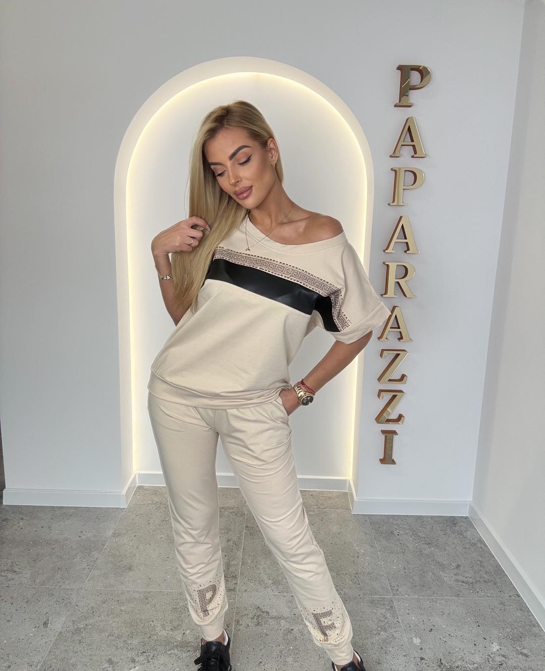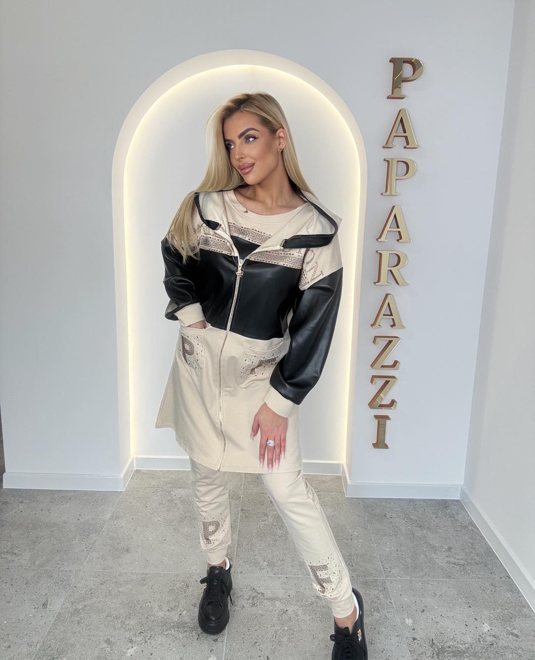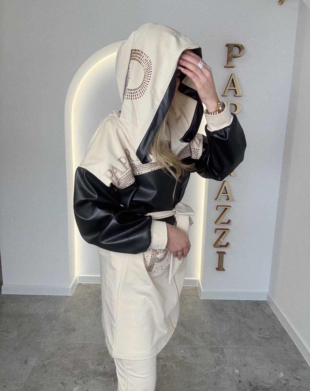 3-set z połączenia bawełny i ekoskóry. Długa rozpinana bluza z kapturem oraz bluzka z kontrastowymi paskami. Klasyczne dresowe spodnie. Pasek w zestawie.