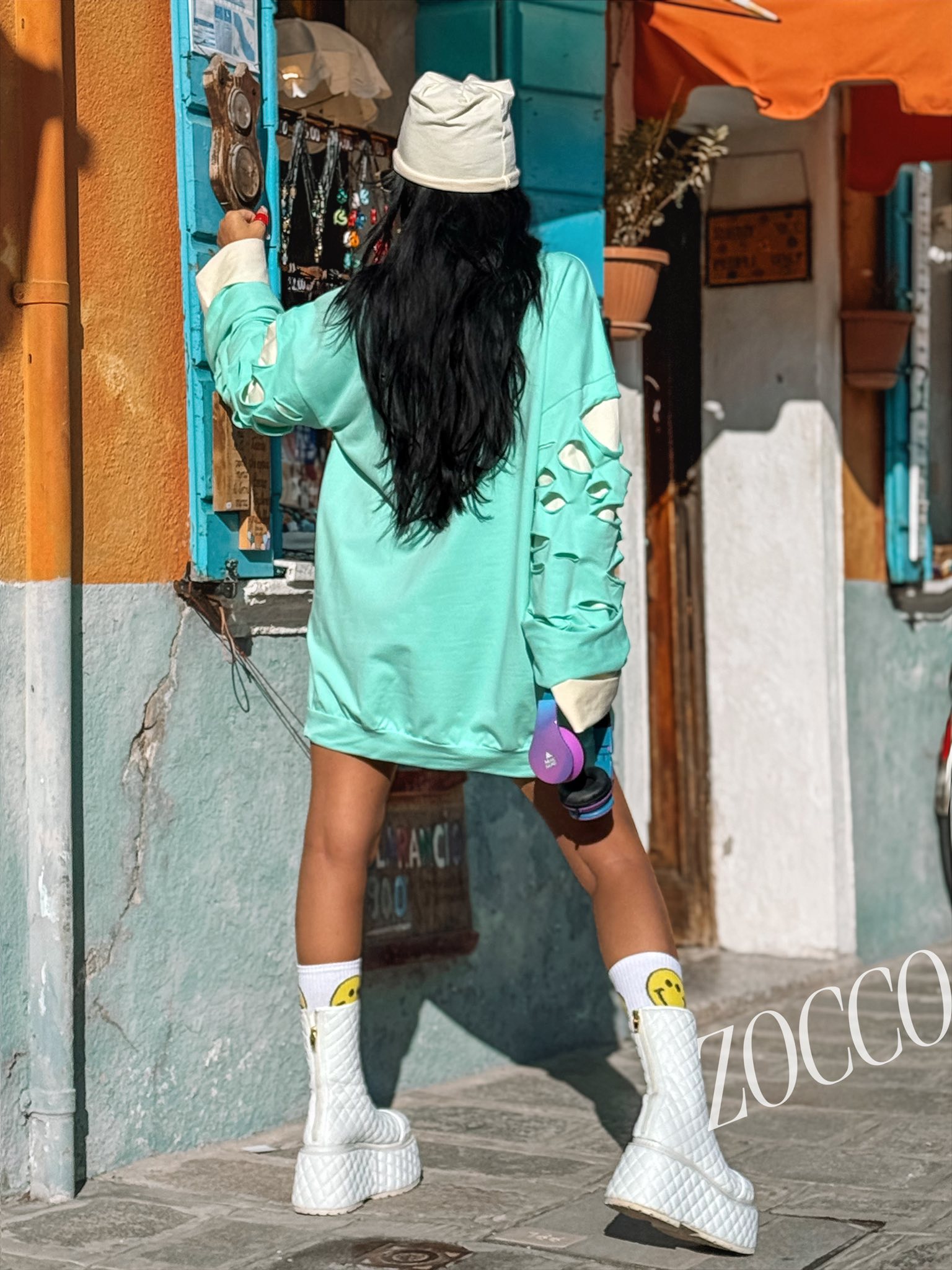 Obszerna dwukolorowa dłuższa bluza/tunika z bawełny, z podwójnymi  efektownie pociętymi rękawami.