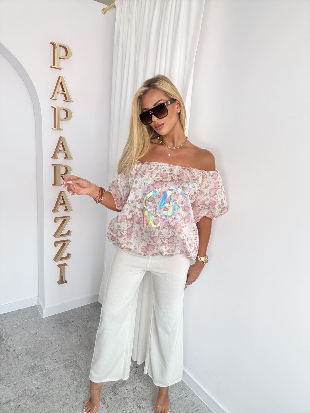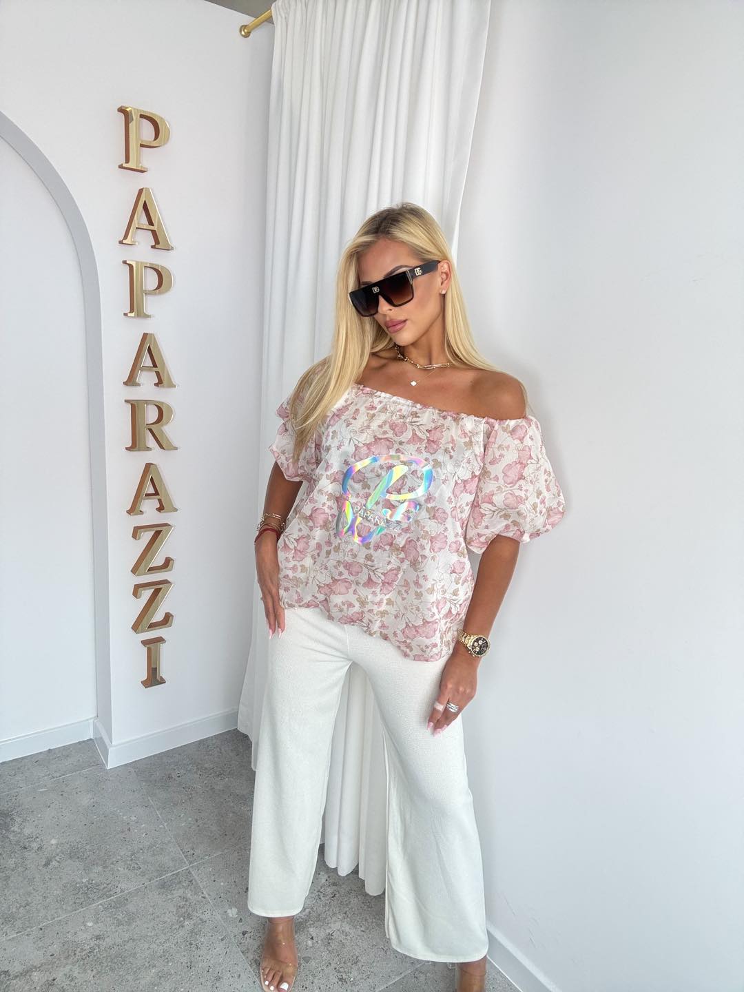 Model o luźnym, oversize’owym kroju z hiszpańskim dekoltem, który można nosić zarówno klasycznie, jak i opuszczony na jedno ramię, podkreślając kobiecy charakter stylizacji. Szerokie, bufiaste rękawy dodają jej lekkości i romantycznego wyrazu.