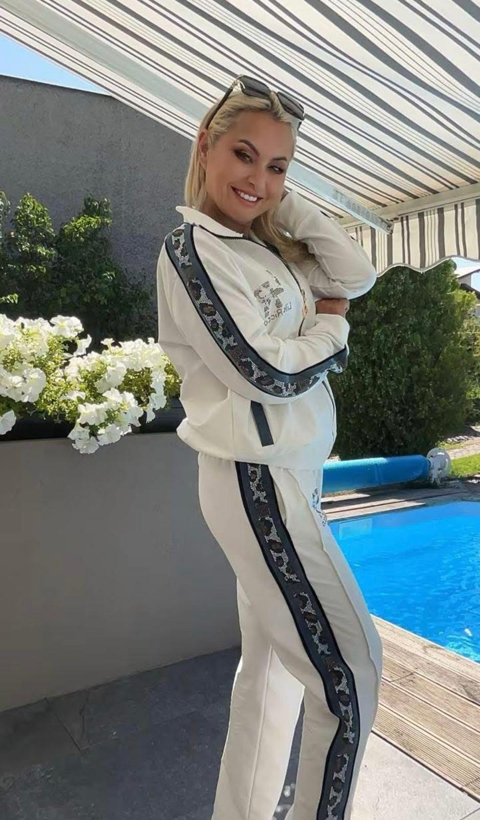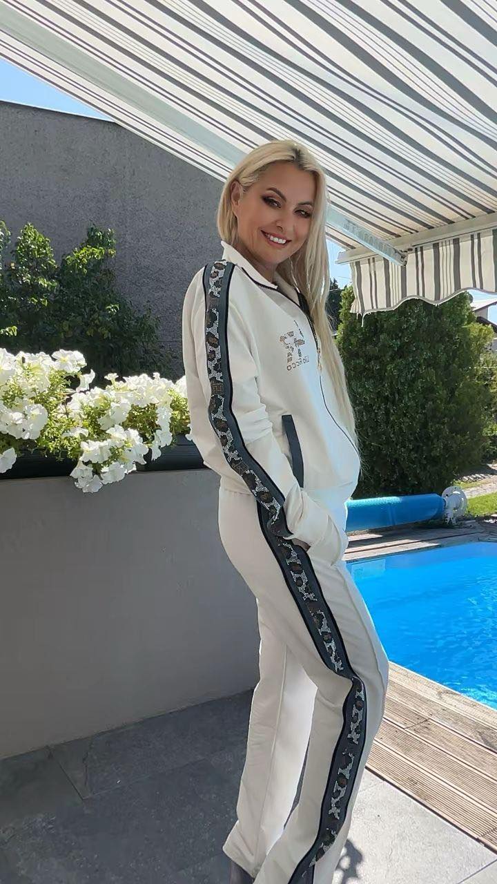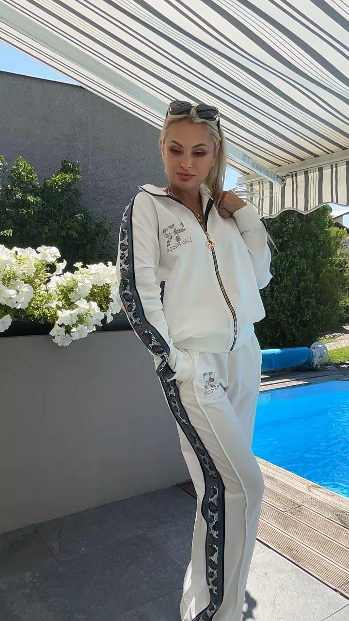 Komplet z błyszczącymi lampasami. Bluza zapinana na zamek, po bokach kieszonki, na rękawkach mieniące kamyczki. Spodnie z błyszczącymi lampasami.