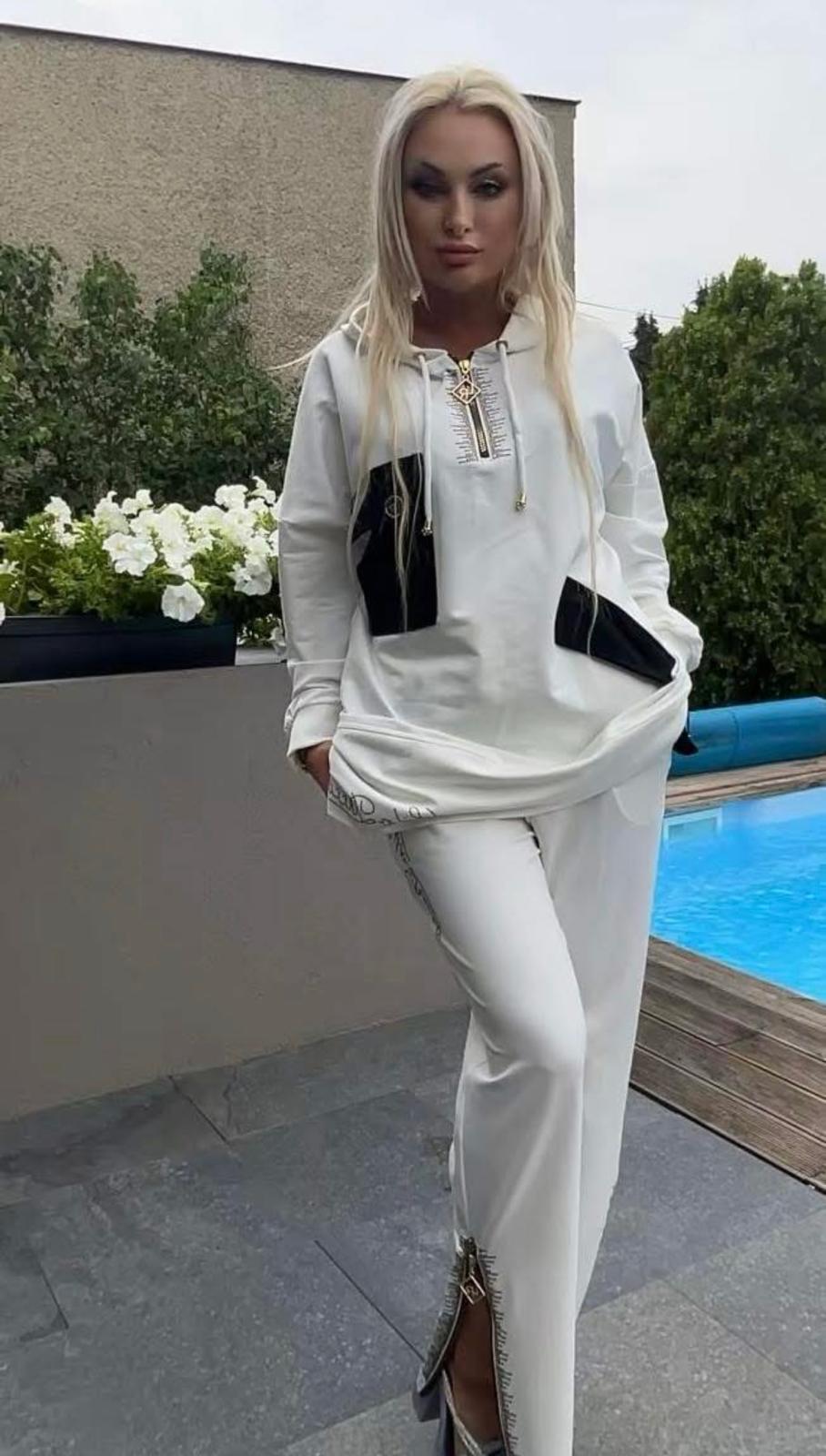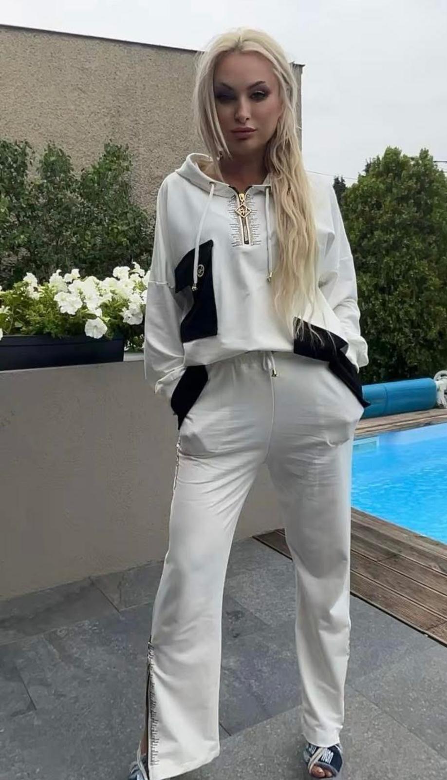 Bluza z kapturkiem, z kontrastowymi kieszonkami, dekoracyjnie wykończony zameczek. Spodnie z rozpinanymi ozdobnymi zameczkami.