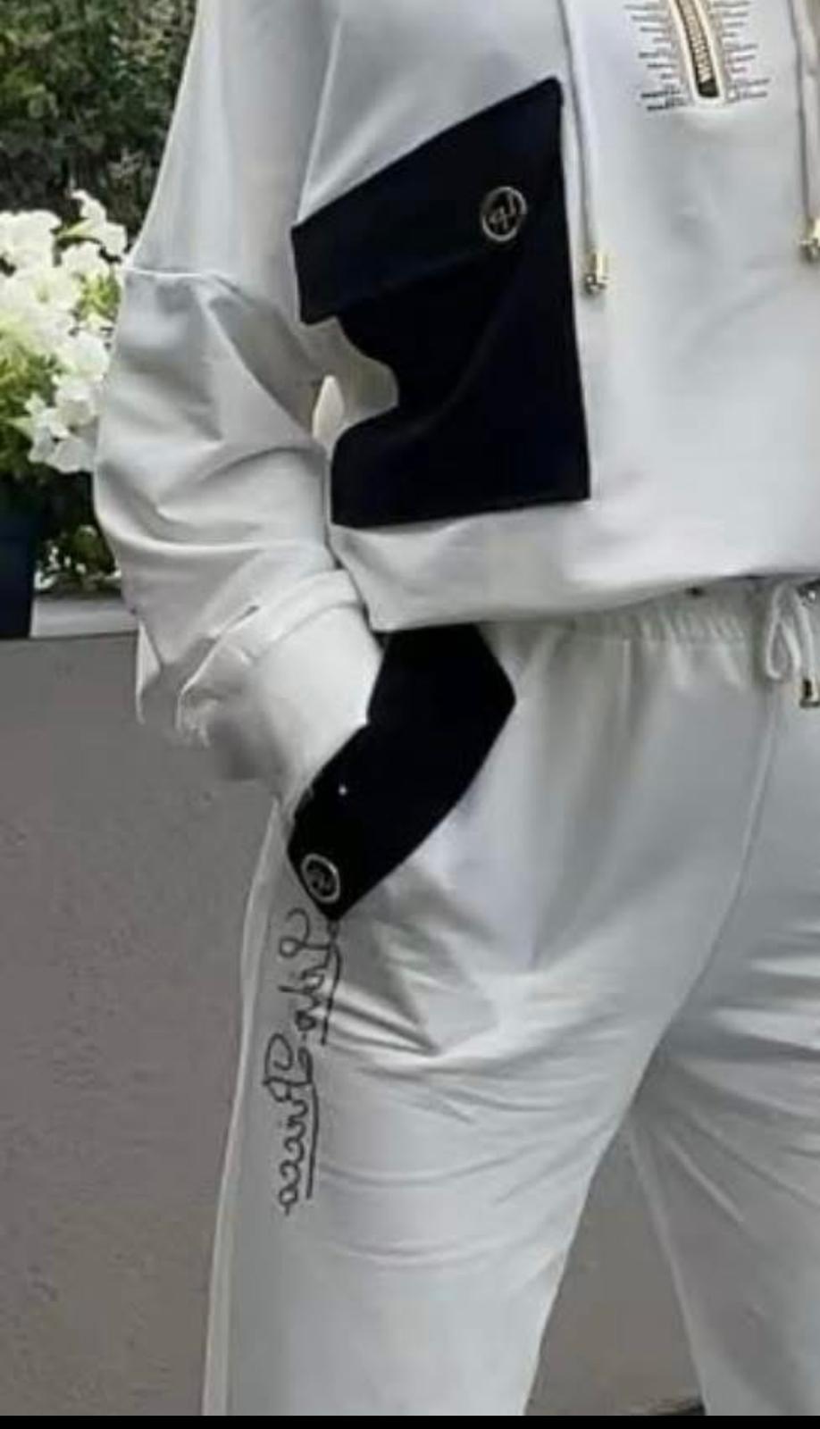 Bluza z kapturkiem, z kontrastowymi kieszonkami, dekoracyjnie wykończony zameczek. Spodnie z rozpinanymi ozdobnymi zameczkami. Rozmiar: Bluzka: Biust:62x2 Pas:57x2 Długość:72/76cm Spodnie: Pas:37-53x2 Biodra:53-60x2 …