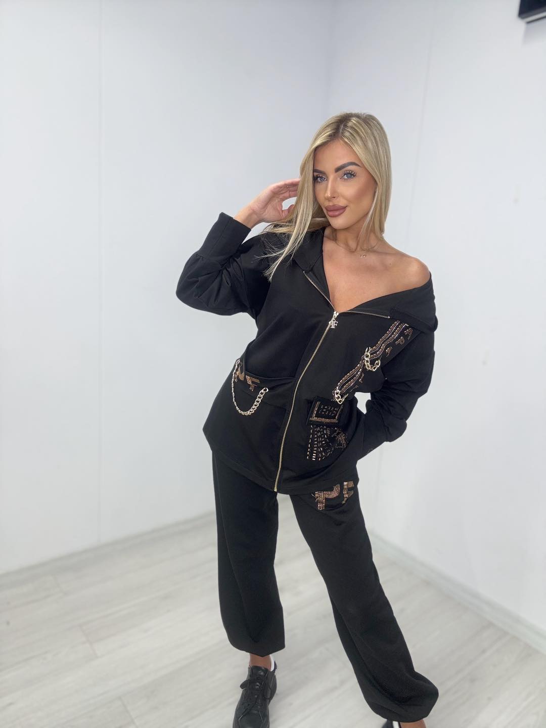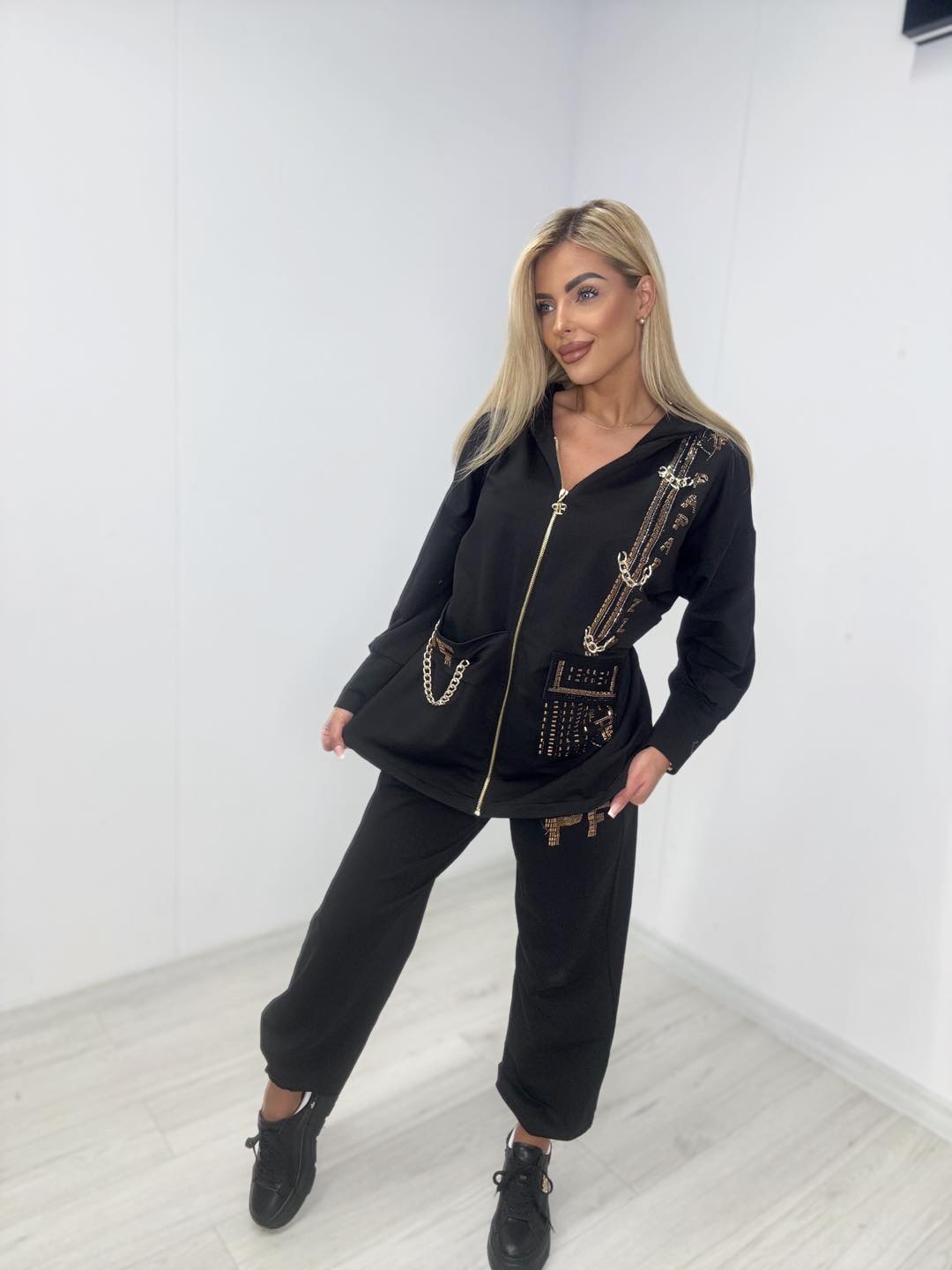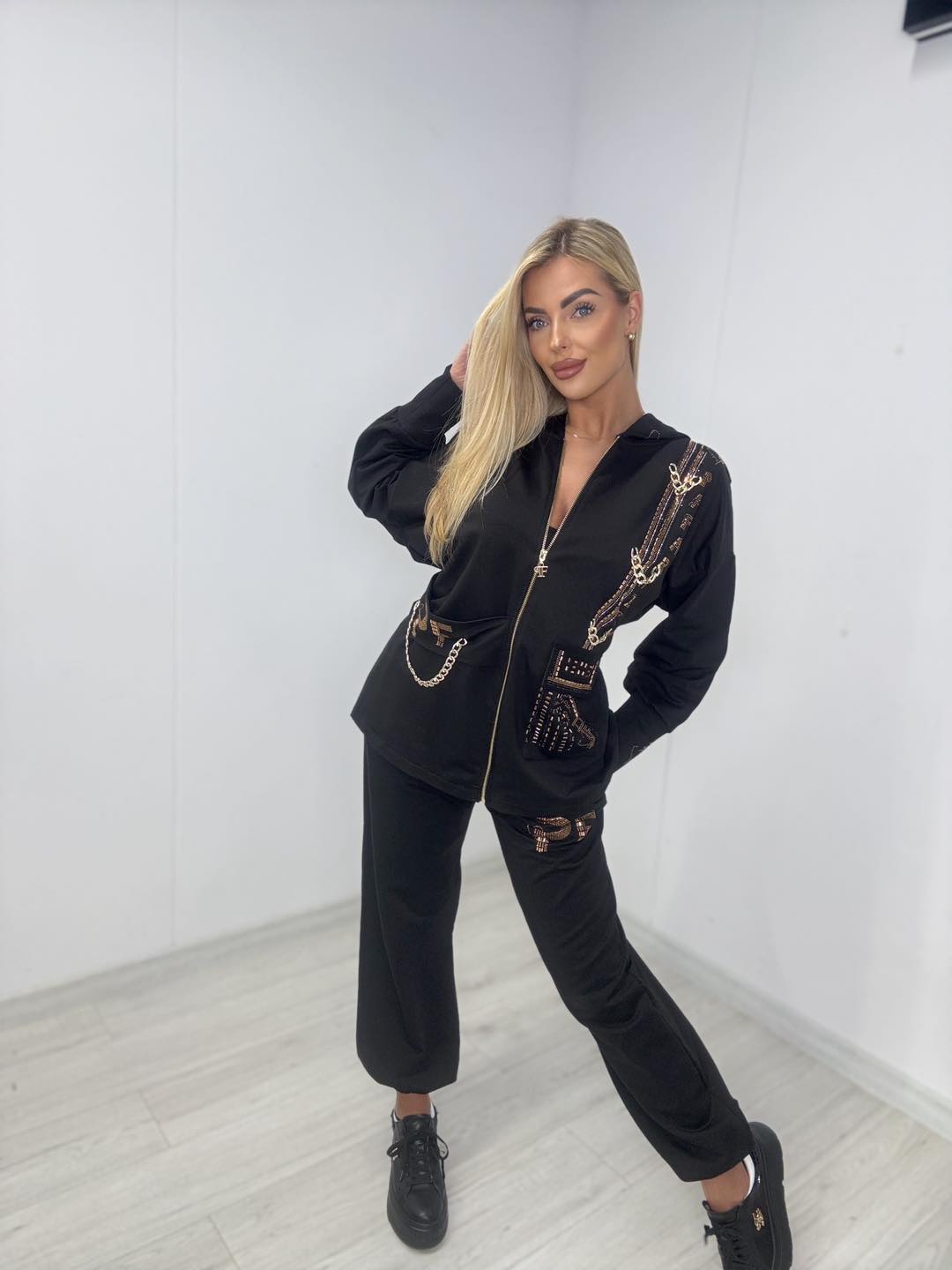 Komplet składający się z bogato zdobionej bluzy z kapturem, zapinanej na zamek oraz luźnych spodni zakończonych gumeczką. Elegancja, wygoda i błysk w jednym – ten model to absolutny hit dla kobiet, które kochają wyróżniać się stylem.