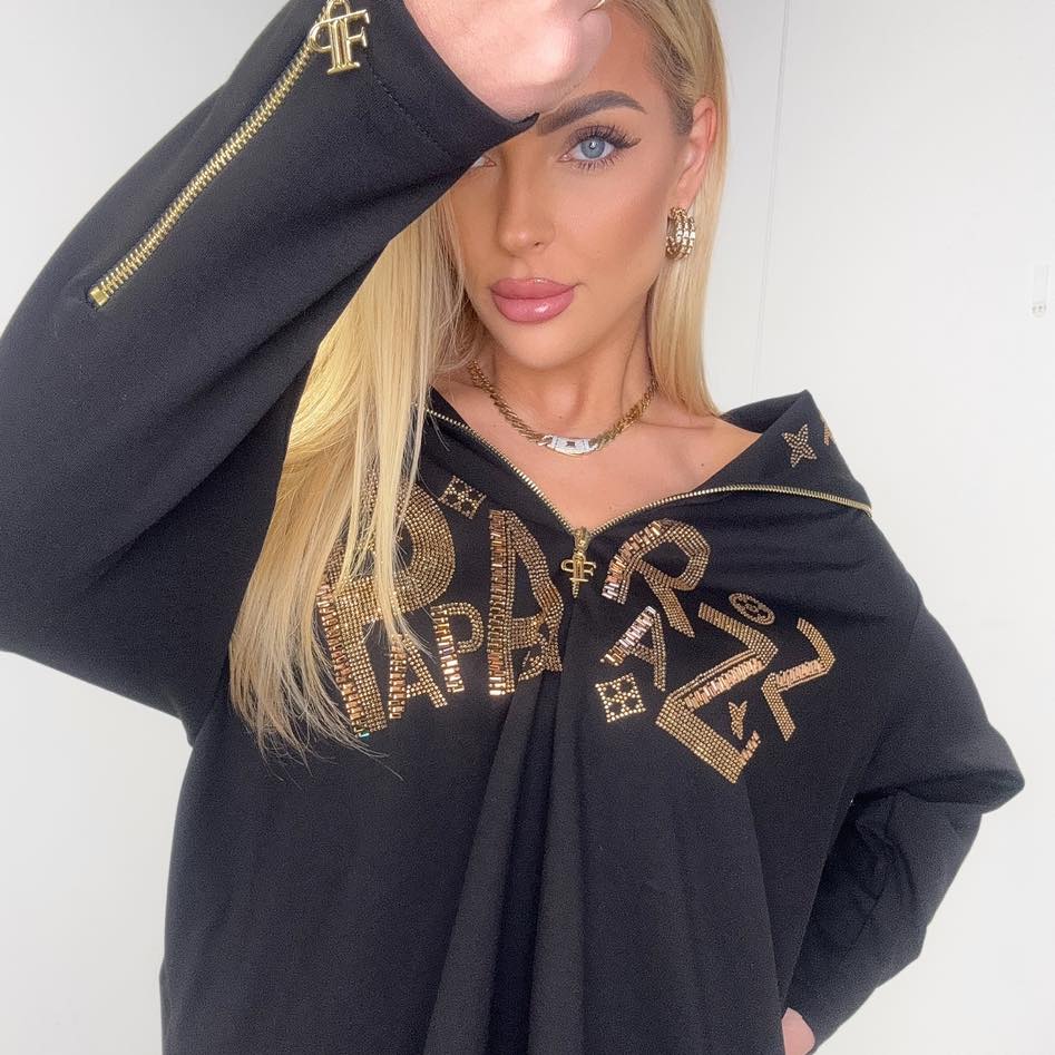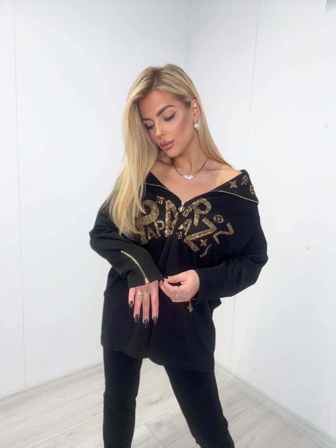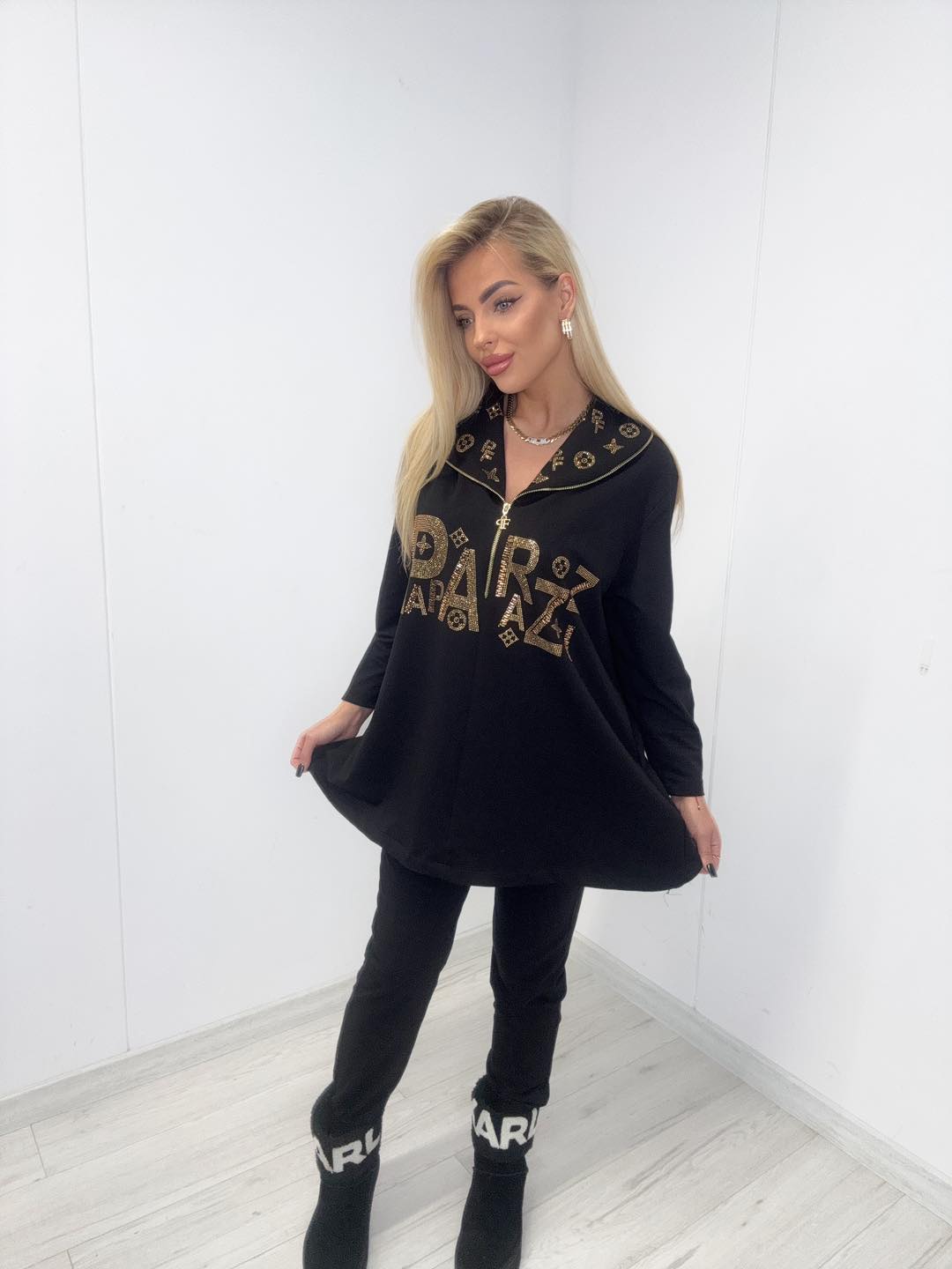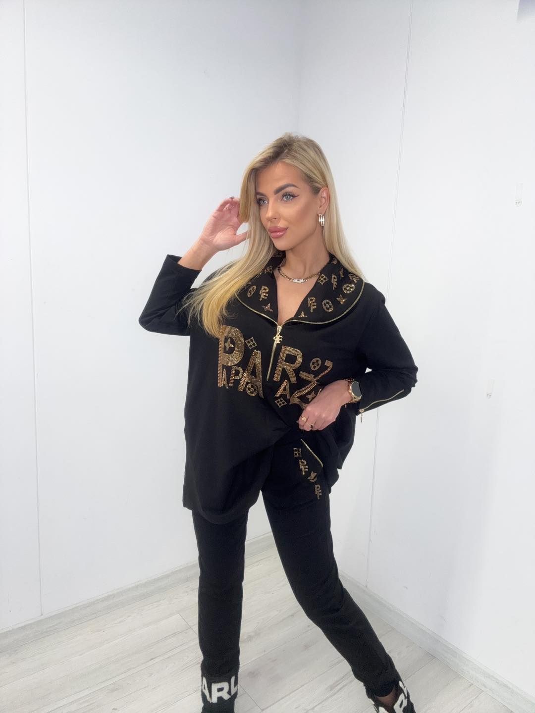 Komplet dresowy z ozdobnymi napisami na przodzie bluzy. Spodnie klasyczne, zakończone gumeczką. Rozmiar: Bluza: Biust:65x2 Pas:55x2 Długość: 77cm Spodnie: Pas:40-55x2 Biodra:60x2 …