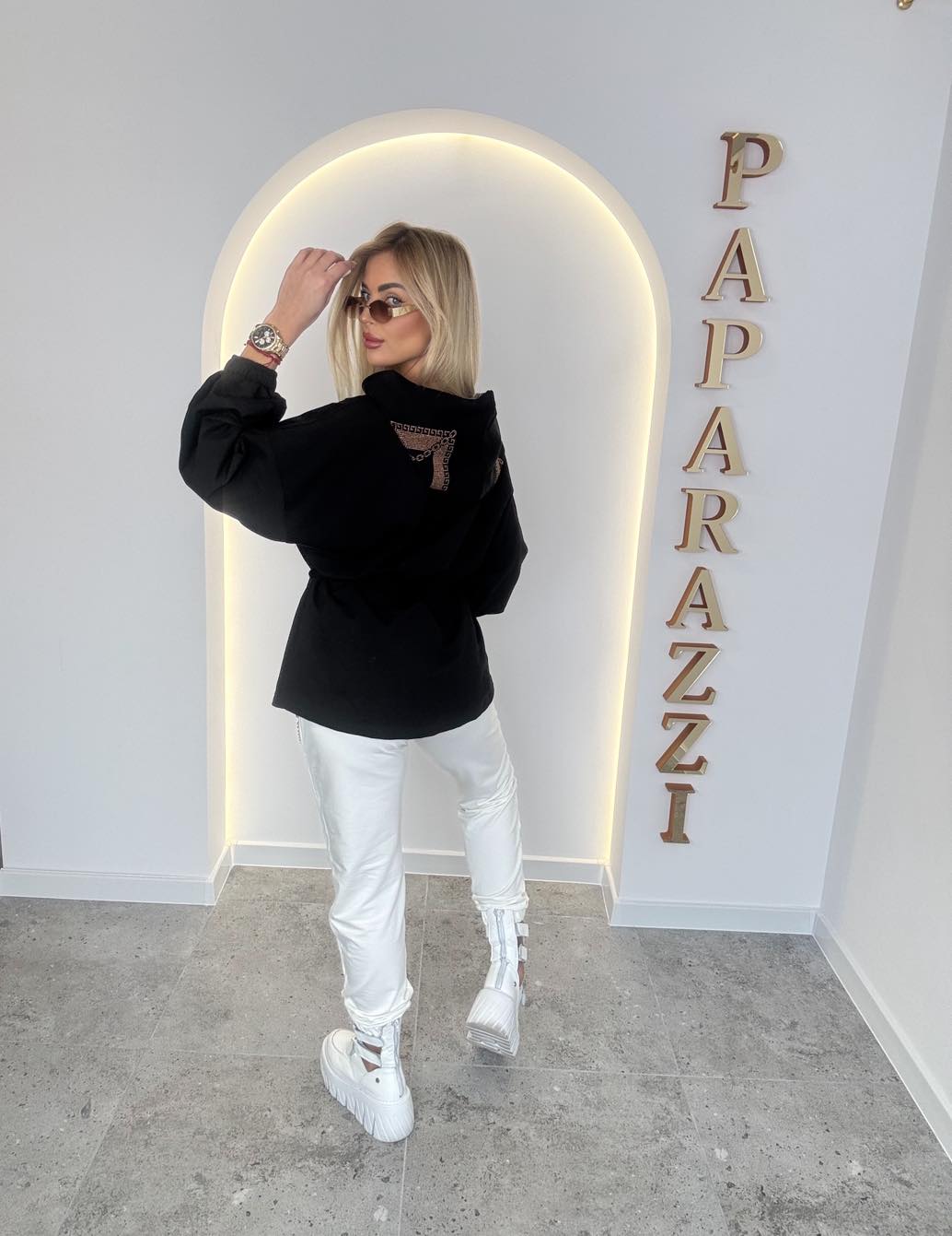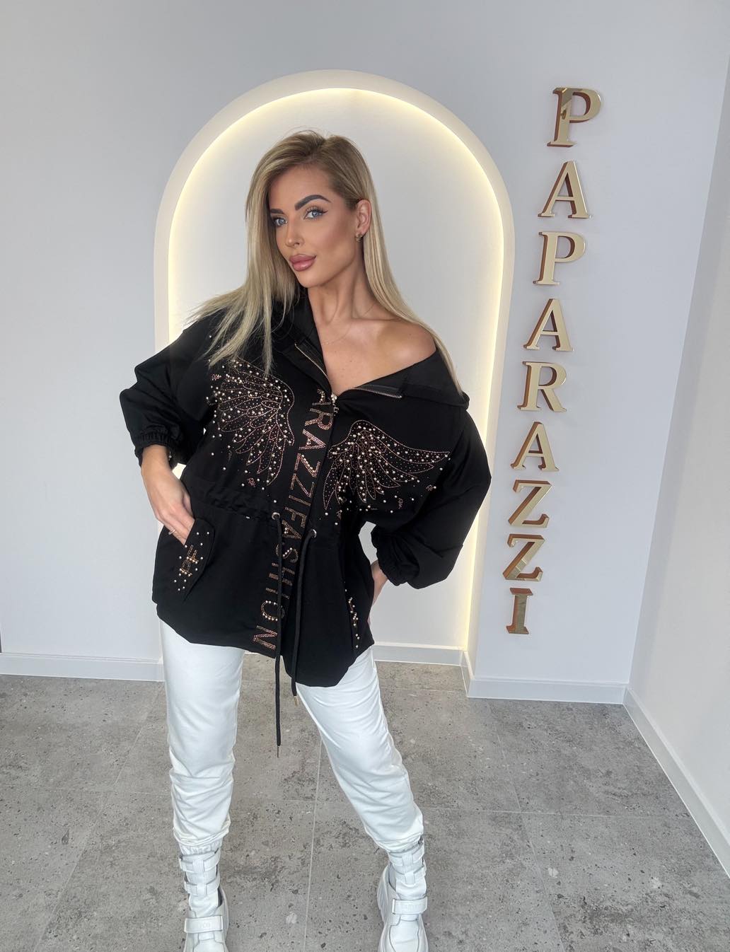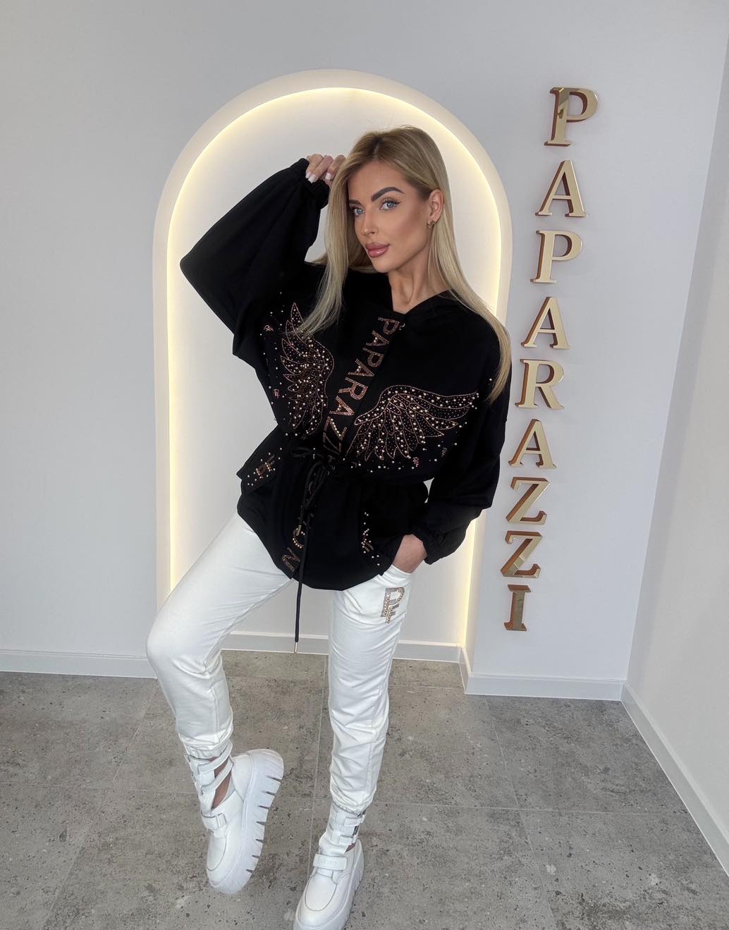 Bluza z kapturem z ozdobnymi skrzydłami wykończonymi złotymi perełkami oraz ściągaczem w pasie. Spodnie o klasycznym sportowym kroju zakończone ściągaczem. Bluza: Biust:67-70x2 Pas:65x2 Długość: 73cm Spodnie: …