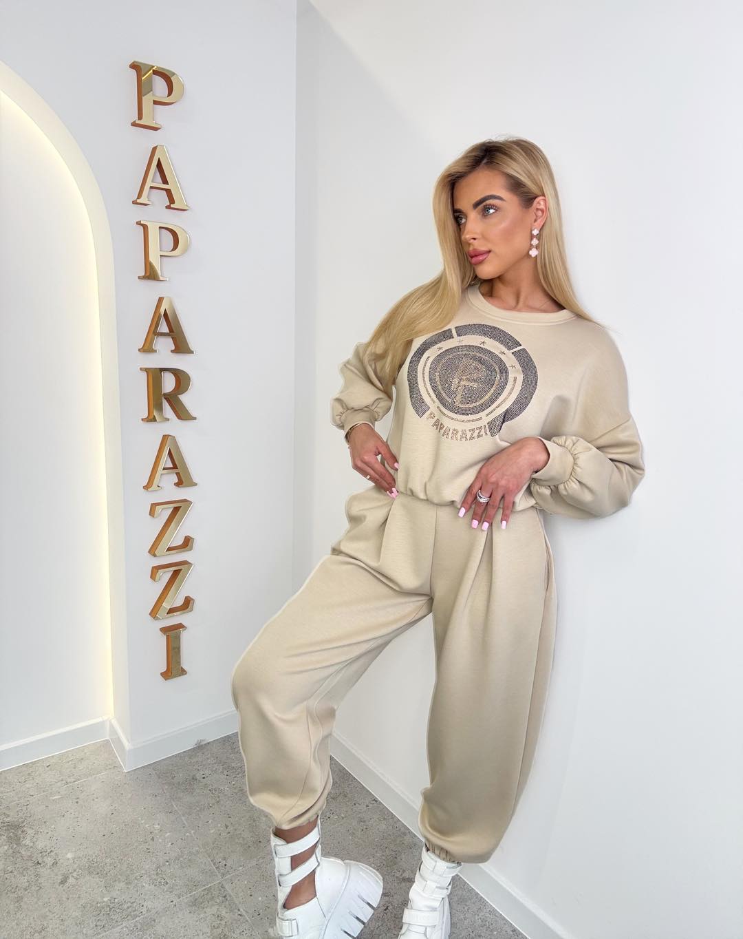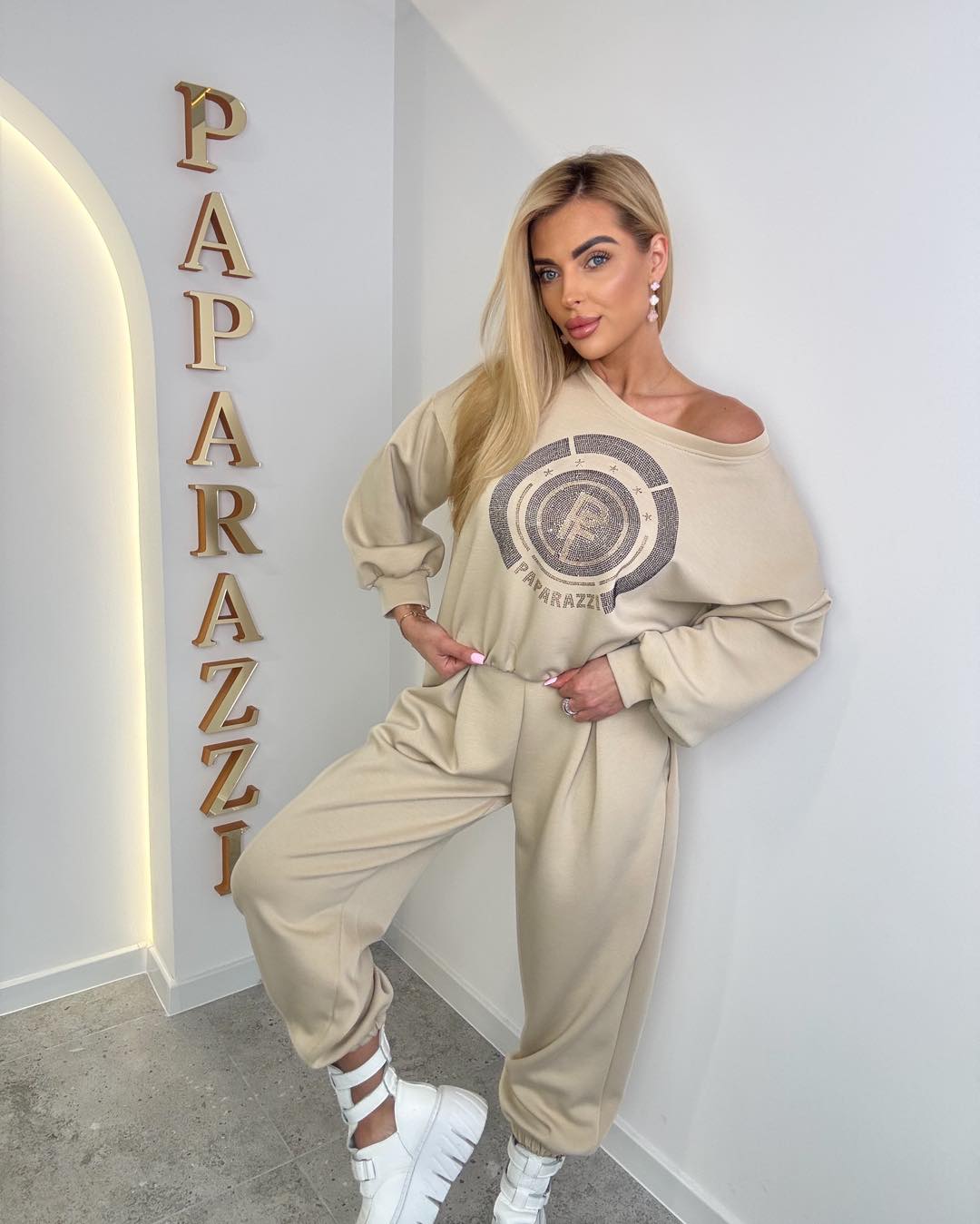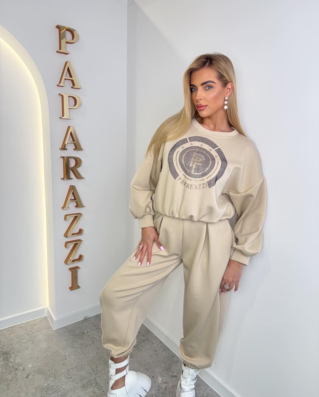 Dres z przyjemnego materiału „masełko”. Bluza ze złotymi kamyczkami na przodzie. Spodnie o szerokim kroju, zakończone ściągaczami.