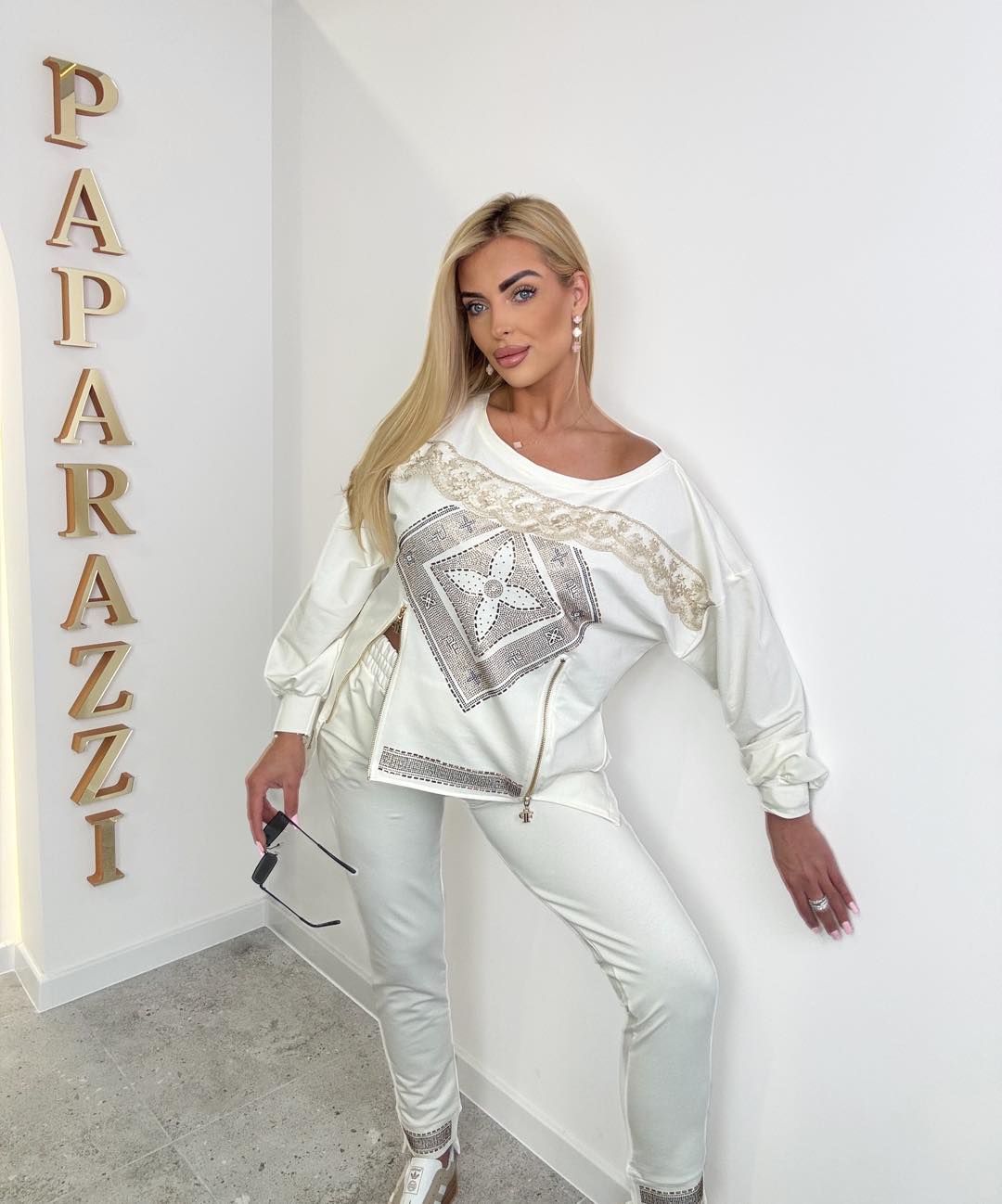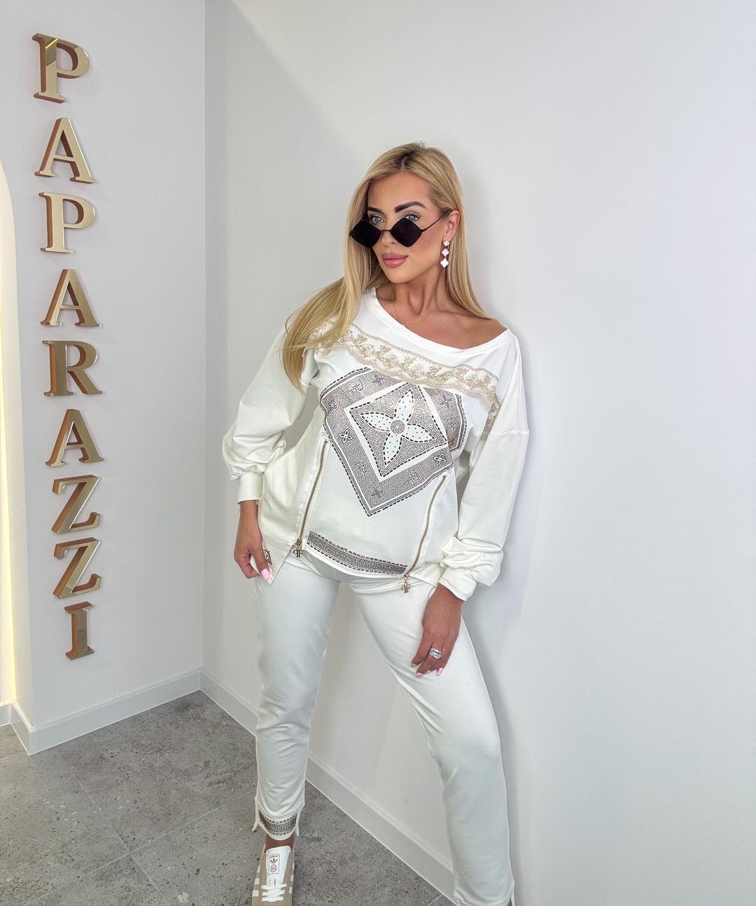 Bluza z ozdobnymi zamkami z możliwością rozpięcia od dołu, na karczku efektowna koronka. Spodnie o prostym kroju, nogawki zakończone dekoracyjnymi kamyczkami.