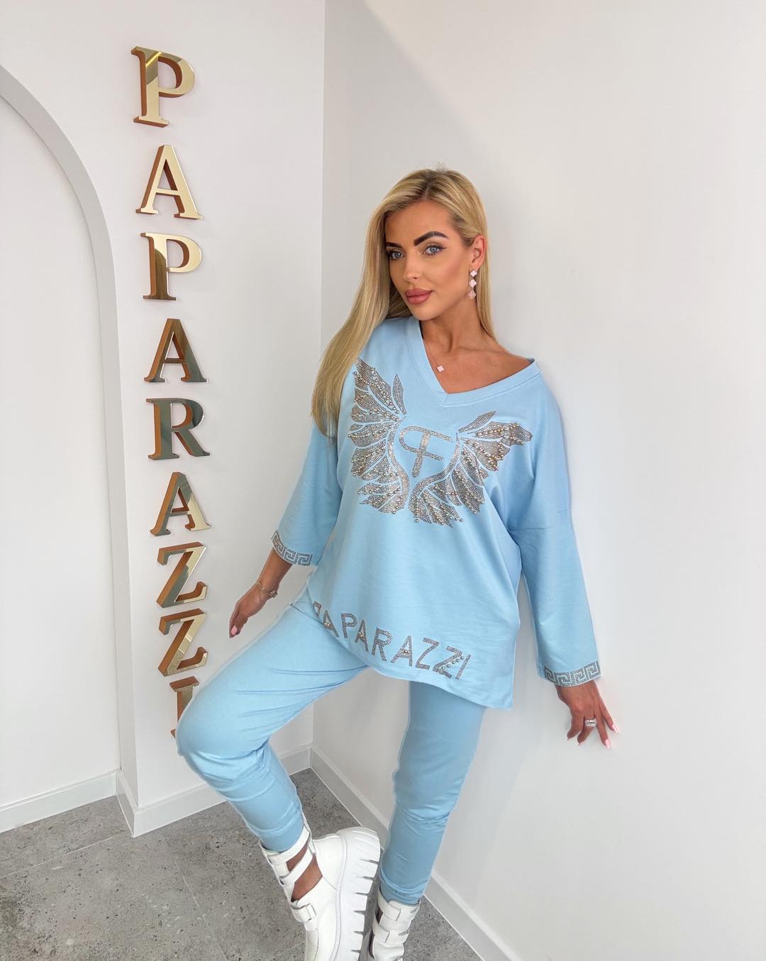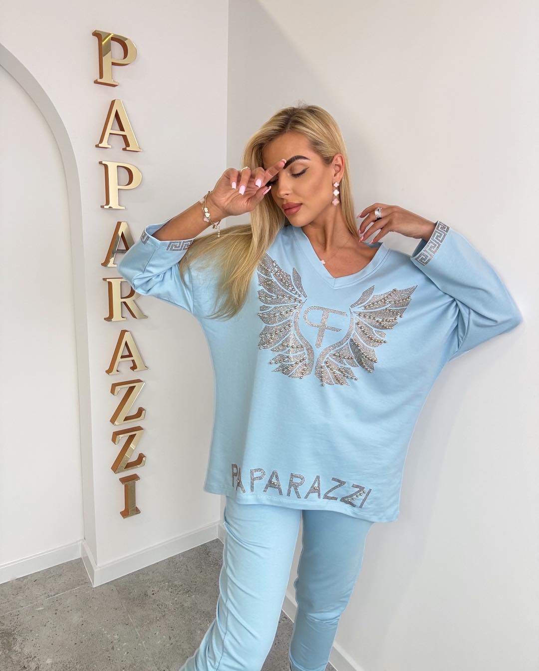 Bluza z dekoltem w szpic ze złotymi skrzydłami i perełkami. Rozmiar: Bluza: Biust:65x2 Pas:65x2 Długość: 75/78cm Spodnie: Pas: 40-55x2 Biodra:60x2 Długość:107cm