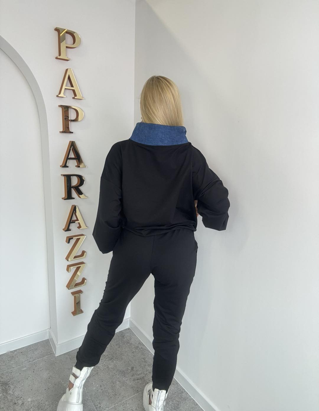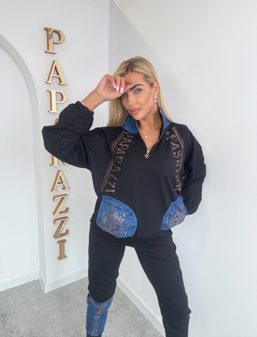 Bluza zapinana na zamek pod szyją, z wysoką stójką i jeansowymi kieszeniami. Na jednej nogawce jeansowa wstawka. Rozmiar: Bluza: Biust:65x2 Pas:40-55x2 Długość: 68cm Spodnie: Pas:40-55 x2 …