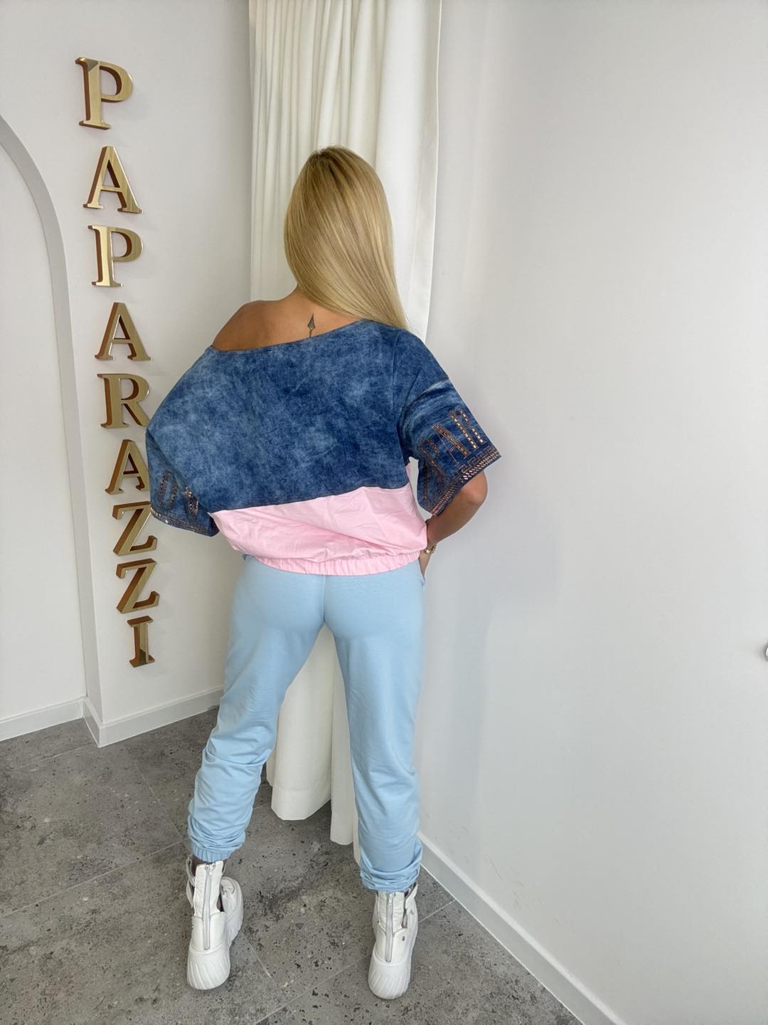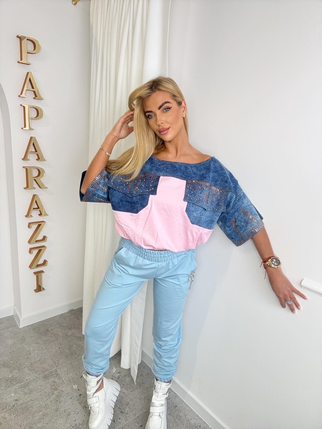 Bluza z połączeniem bawełny i jeansu, z gumką w pasie. Rękawki szerokie ozdobione złotymi aplikacjami. Spodnie na szerokiej gumie o klasycznym sportowym kroju, zakończone ściagaczami. Rozmiar: Bluza: …