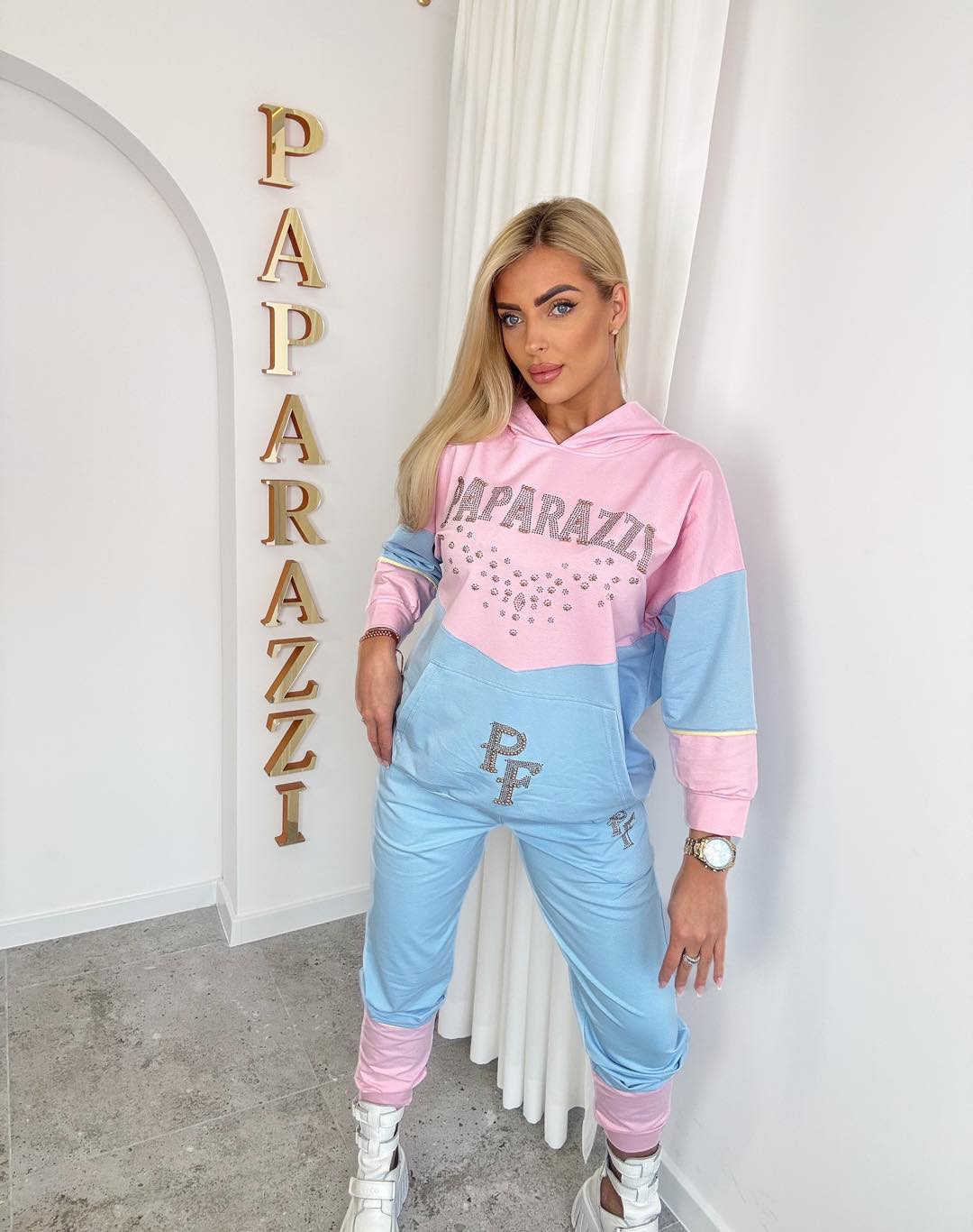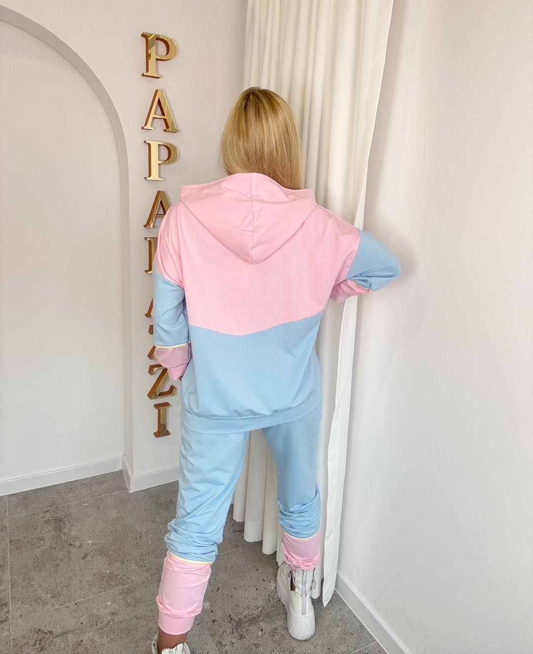 Stylowy dres w kontrastowym połączeniu niebieskiego i różu. Bluza z kapturem ozdobiona logo i delikatnymi zdobieniami nadaje całości kobiecego charakteru, a wygodne spodnie zapewniają komfort noszenia przez cały dzień. Idealny na co dzień – sportowo, ale z klasą ✨