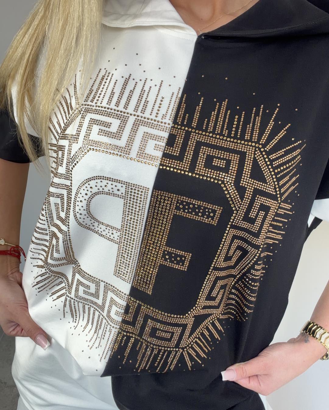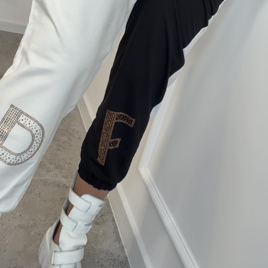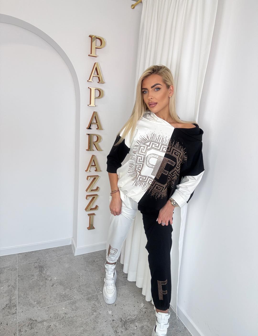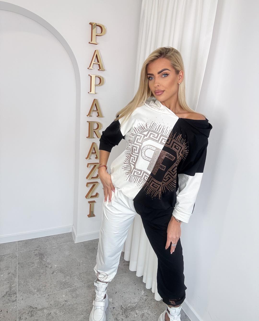 Stylowy dres w kontrastowym połączeniu czerni i bieli. Bluza z kapturem ozdobiona dużą aplikacją na przodzie nadaje całości kobiecego charakteru, a wygodne spodnie zapewniają komfort noszenia przez cały dzień. Idealny na co dzień – sportowo, ale z klasą ✨