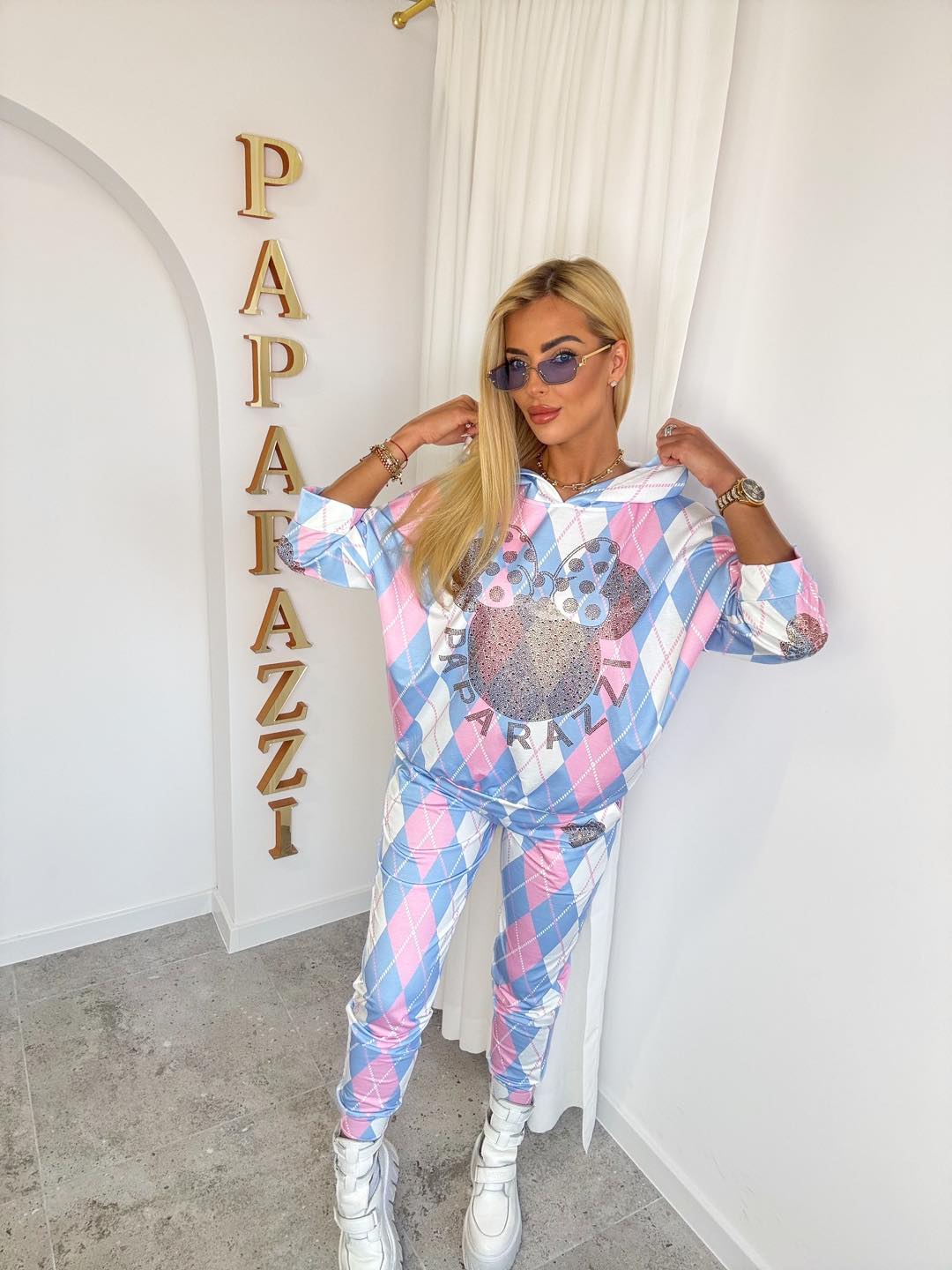Stylowy dres w kolorowe romby. Bluza z kapturem ozdobiona złotym wzorem Miki nadaje całości kobiecego charakteru, a wygodne spodnie zapewniają komfort noszenia przez cały dzień.