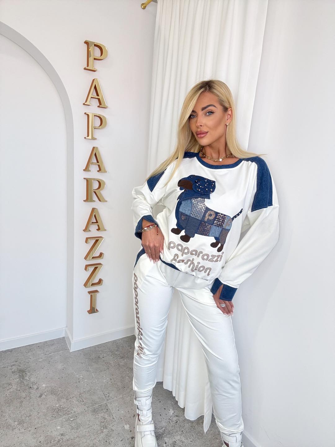 Luźny fason bluzy z kontrastowymi, ciemniejszymi rękawkami i ściągaczami. Z przodu aplikacja jamnika wykonana z jeansowego patchworku. Spodnie o klasycznym kroju . Wyjątkowy styl i komfort.