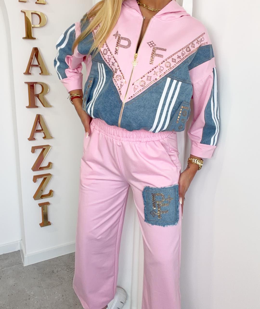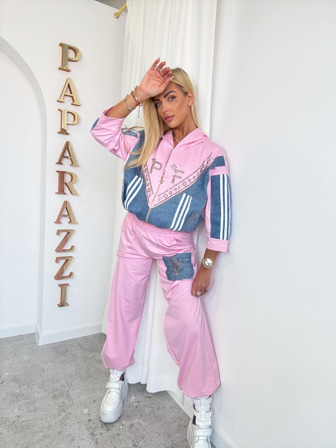 Sportowa elegancja to ten wyjątkowy dres. Bluza rozpinana z kapturem, z jeansowymi wstawkami, lampasami i pięknie mieniącymi się cyrkoniami. Spodnie o klasycznym sportowym stylu. Bluza: Biust:60x2 Pas:50x2 Długość:56 cm …