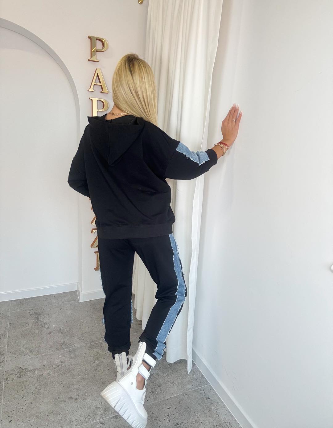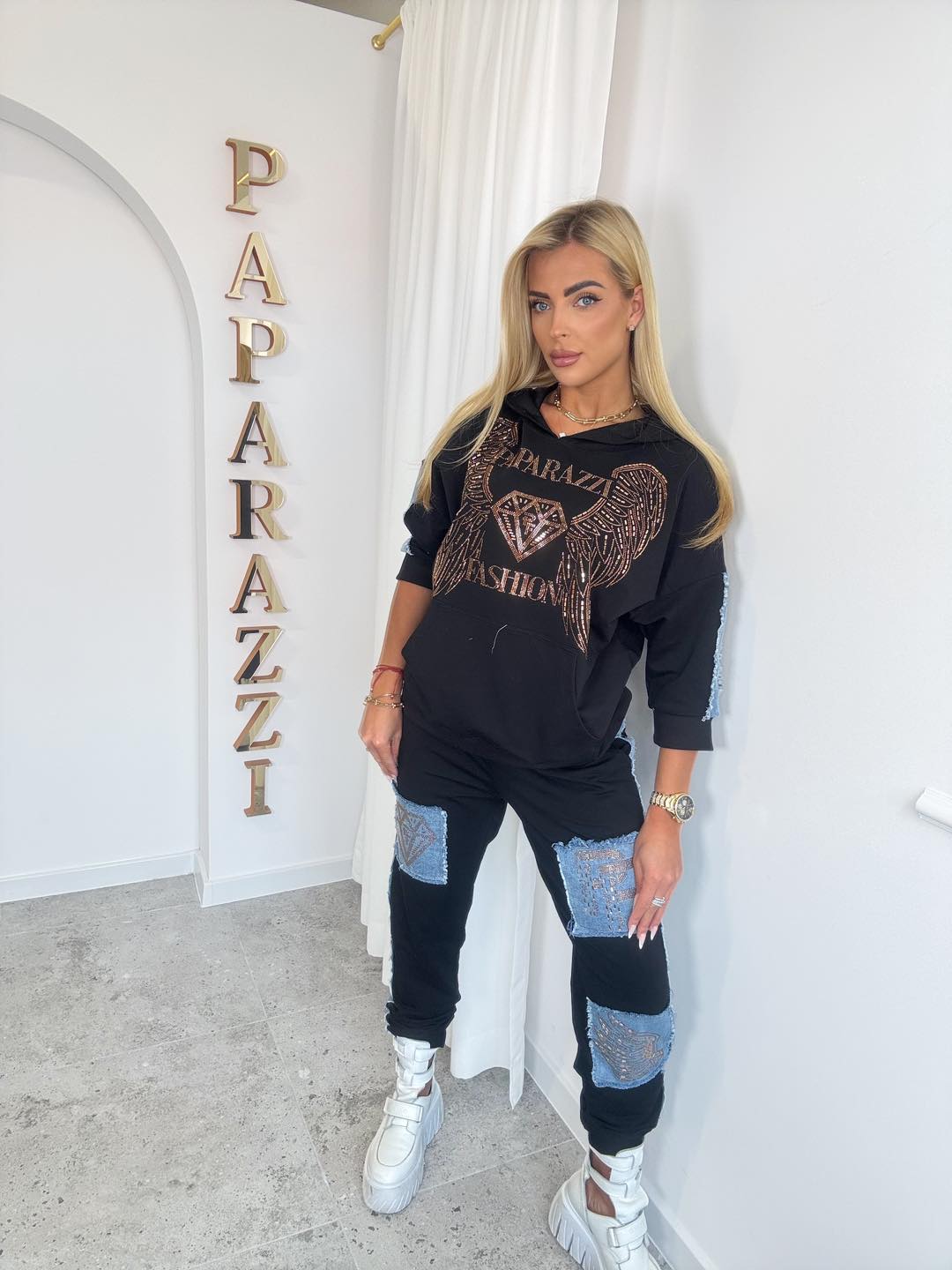 Luźny fason bluzy z kapturem. Z przodu złote dekoracyjne skrzydła. Spodnie o klasycznym kroju . Wyjątkowy styl i komfort.