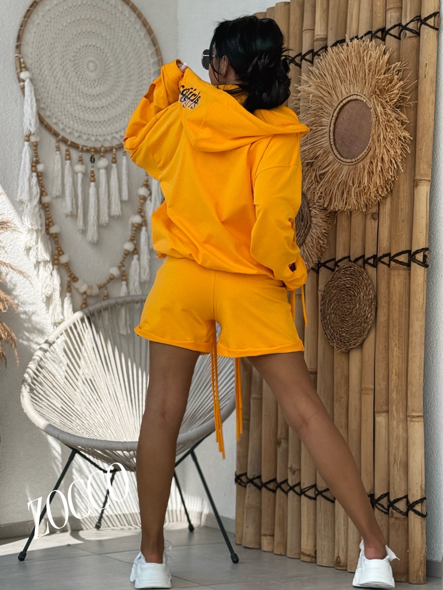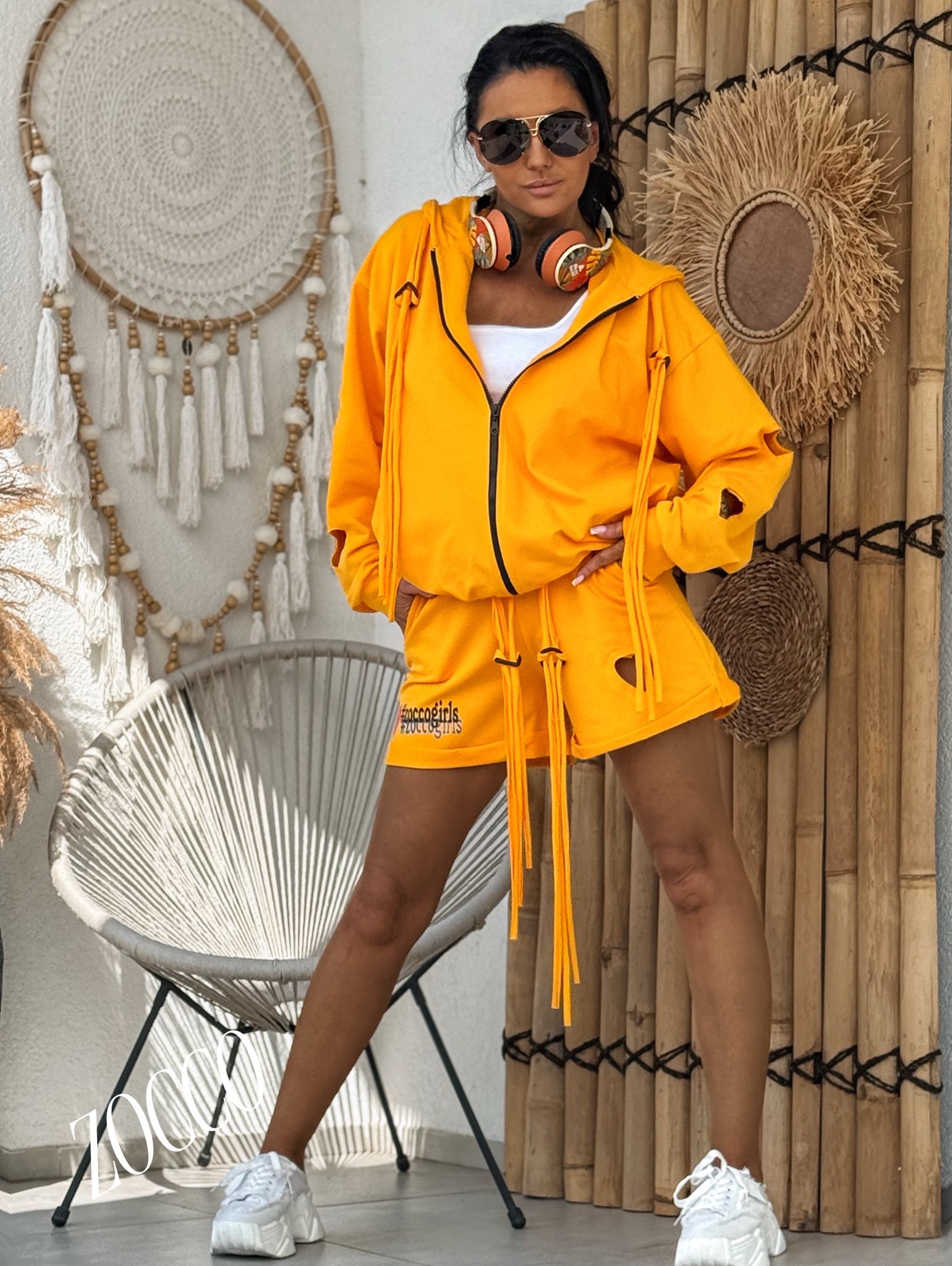 Bawełniany dres, rozpinana bluza z kapturem wykończona długimi dekoracyjnymi troczkami, dekoracyjnie wycięte serduszka na bluzie oraz spodenkach dodają uroku. Rozmiar: Bluza: Biust;68x2 Pas:51-60x2 Długość:67cm Spodenki; …