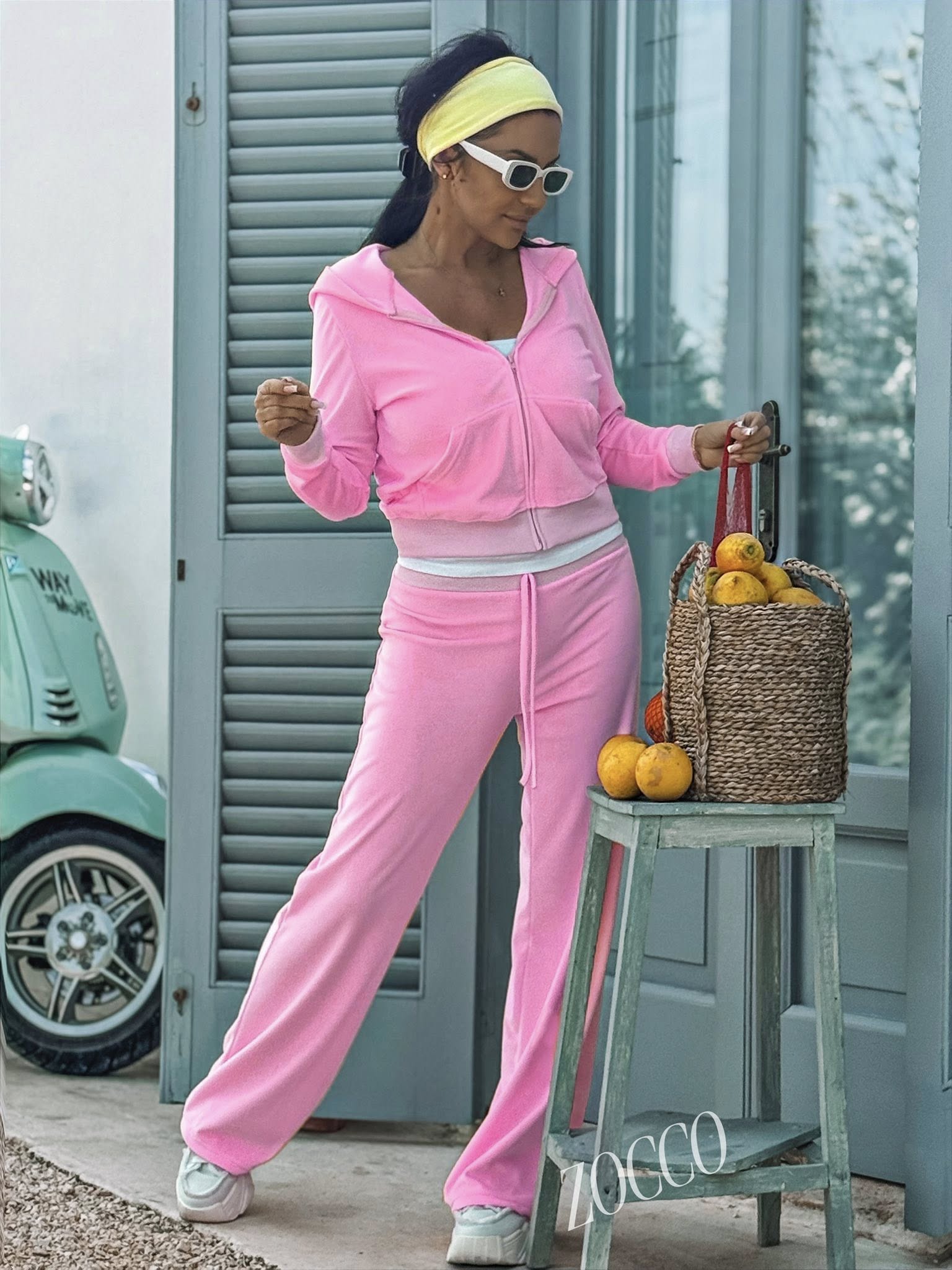 Dres welurowy ,,Gabi,,.Krótka rozpinana bluza z kapturem, z kieszonkami . Spodnie z lekko rozszerzonymi nogawkami.
