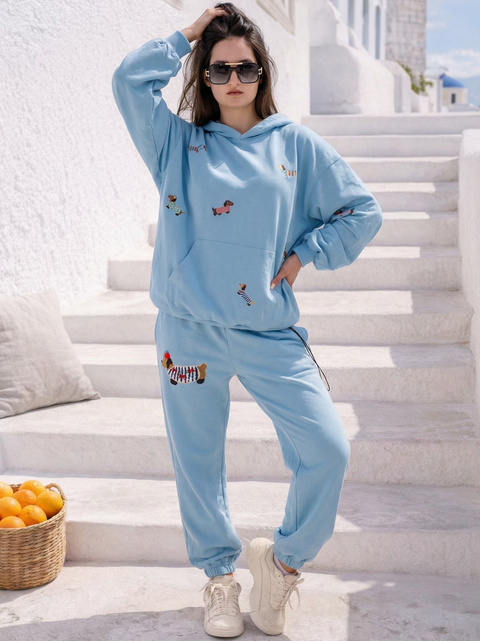 Luźny i swobodny bawełniany dres z kolorowymi naszywkami. Spodnie ściągane gumeczką na dole ,bluza z kapturem i kieszonką kangurką.Wysyłka od środy 25.03.2026