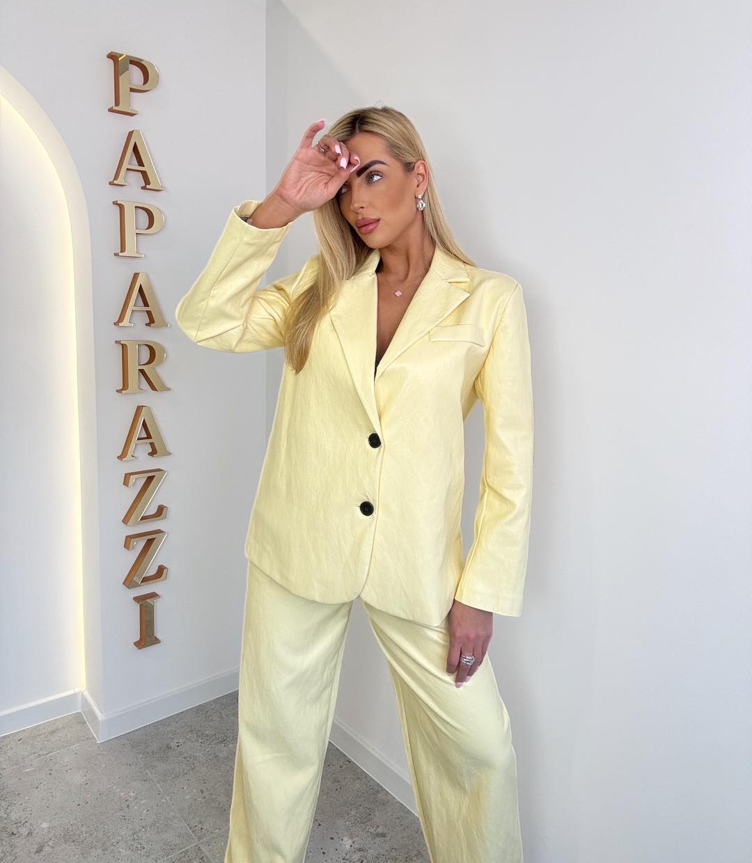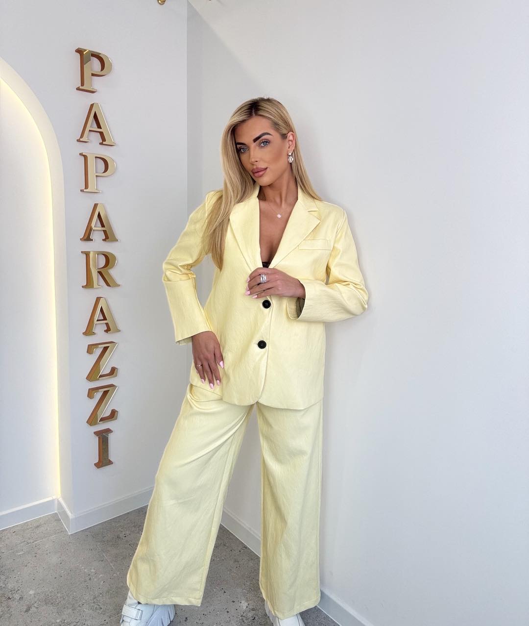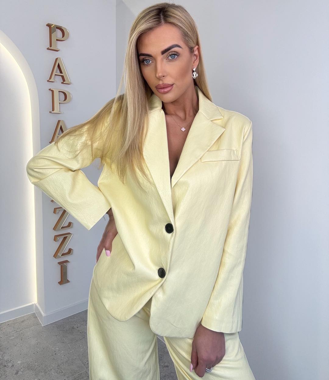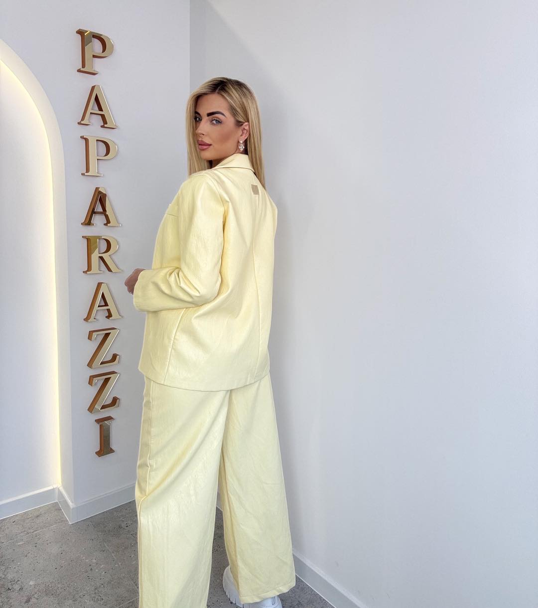 Garnitur z ekoskóry z klasyczną marynarką, spodnie o rozszerzanym kroju.