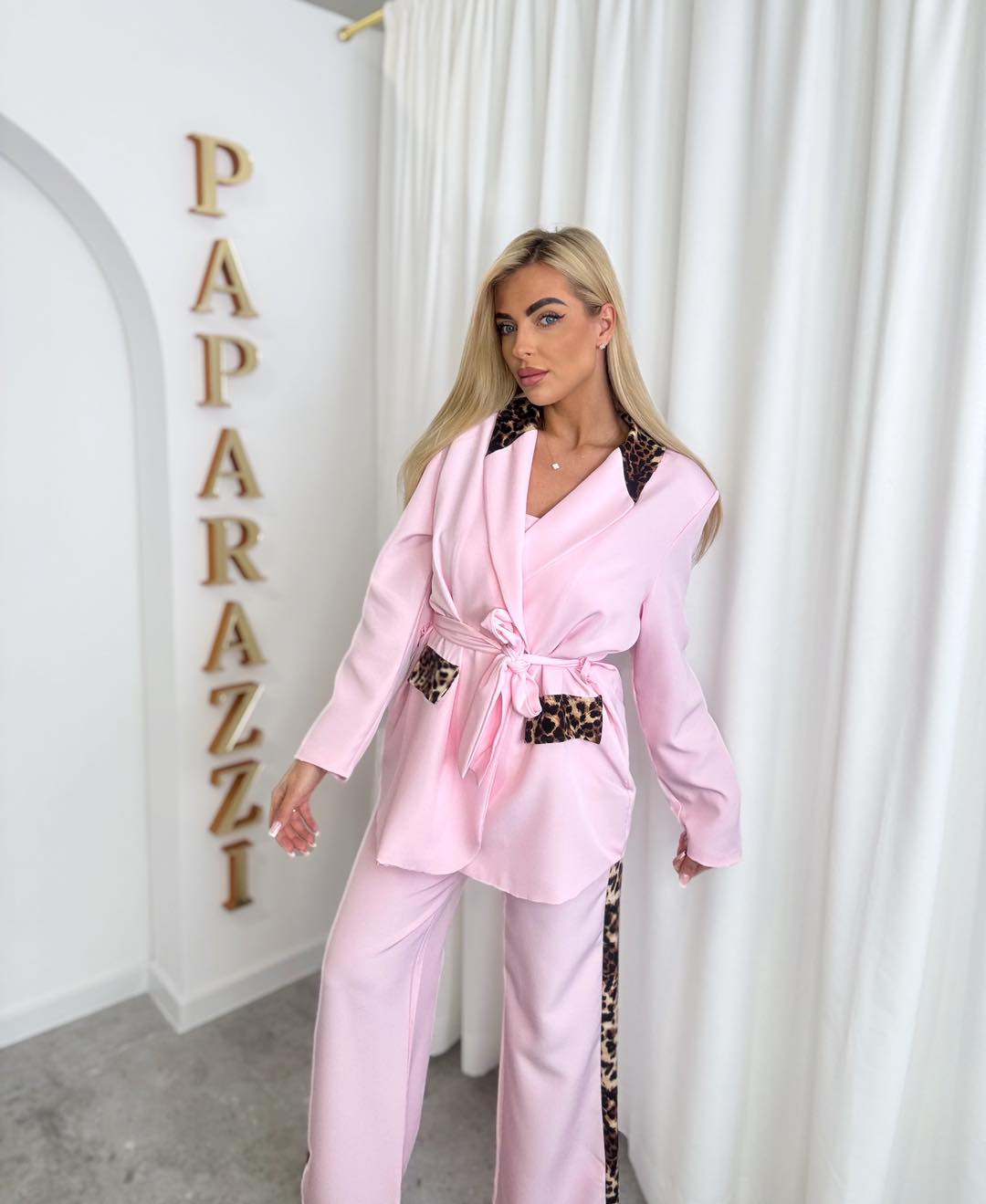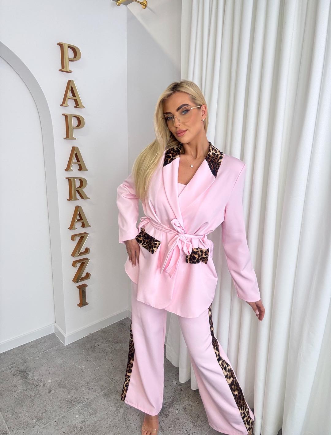 Stylowy garnitur przełamany kontrastowymi wstawkami w zwierzęcy wzór, które dodają całości charakteru. Marynarka z wiązaniem w talii pięknie podkreśla sylwetkę, a spodnie o swobodnym kroju zapewniają komfort i nowoczesny look. …