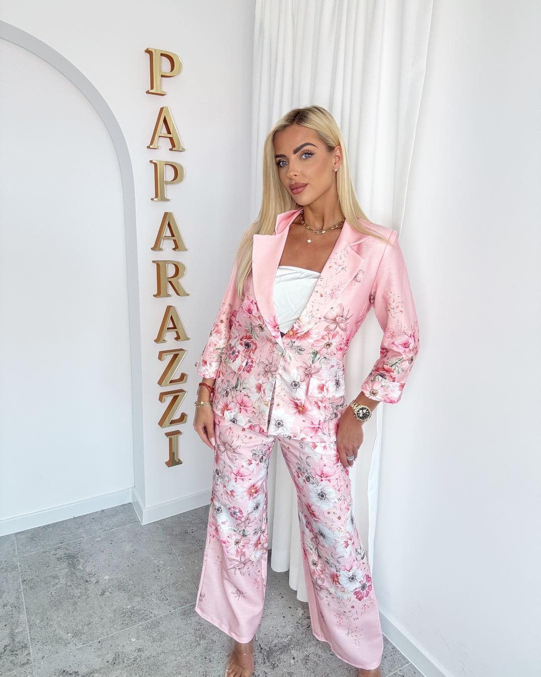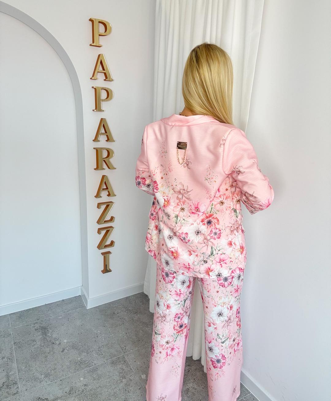 Wyjątkowy garnitur w kwiaty to połączenie klasyki z modowym akcentem. Marynarka o dopracowanym kroju pięknie podkreśla talię, a kwiaty dodają jej eleganckiego charakteru. Subtelne logo „PF” nadaje całości unikalnego, luksusowego wykończenia. Spodnie z szeroką nogawką optycznie wydłużają sylwetkę i zapewniają swobodę ruchów. Lekki, przyjemny w dotyku materiał sprawia, że komplet idealnie sprawdzi się zarówno na wyjątkowe okazje, jak i w stylizacjach biznesowych czy eventowych.