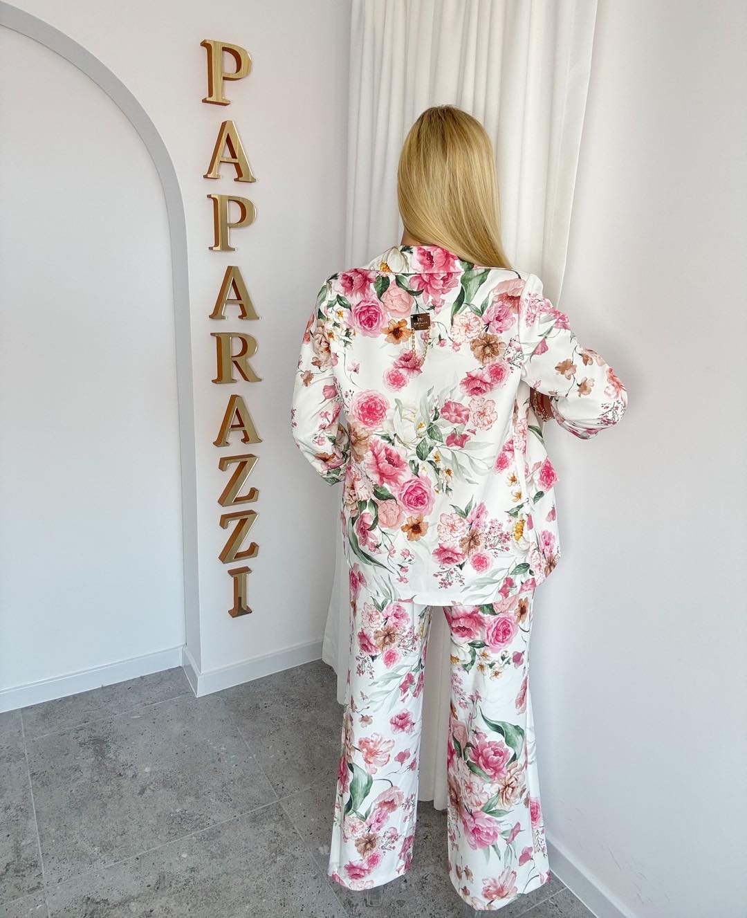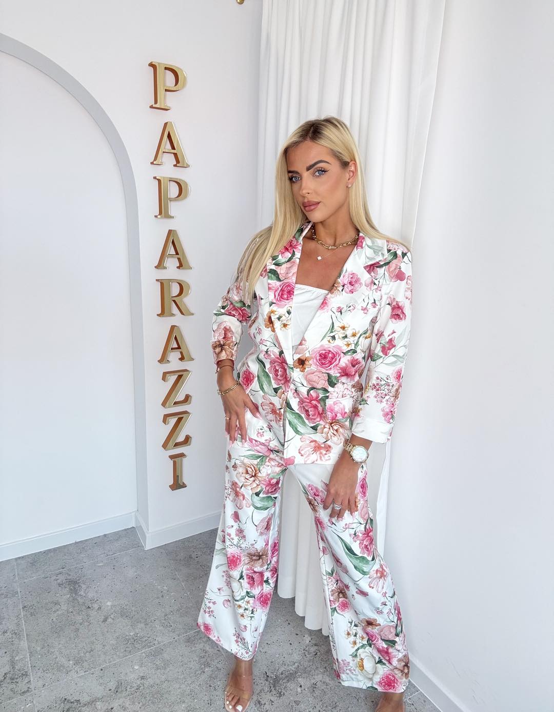 Wyjątkowy garnitur w kwiaty to połączenie klasyki z modowym akcentem. Marynarka o dopracowanym kroju pięknie podkreśla talię, a kwiaty dodają jej eleganckiego charakteru. Subtelne logo „PF” nadaje całości unikalnego, luksusowego wykończenia.