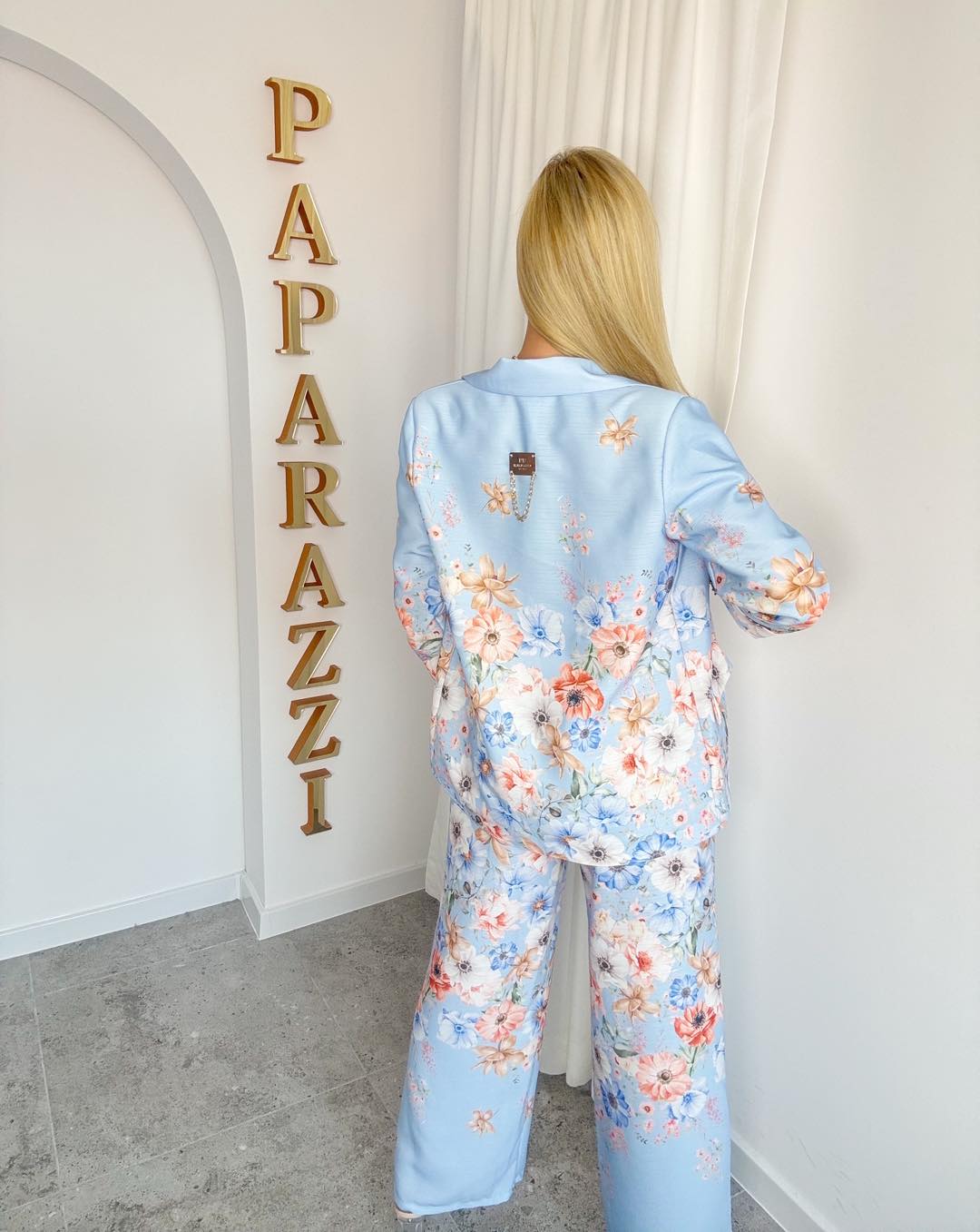 Wyjątkowy garnitur w kwiaty to połączenie klasyki z modowym akcentem. Marynarka o dopracowanym kroju pięknie podkreśla talię, a kwiaty dodają jej eleganckiego charakteru. Subtelne logo „PF” nadaje całości unikalnego, luksusowego wykończenia.