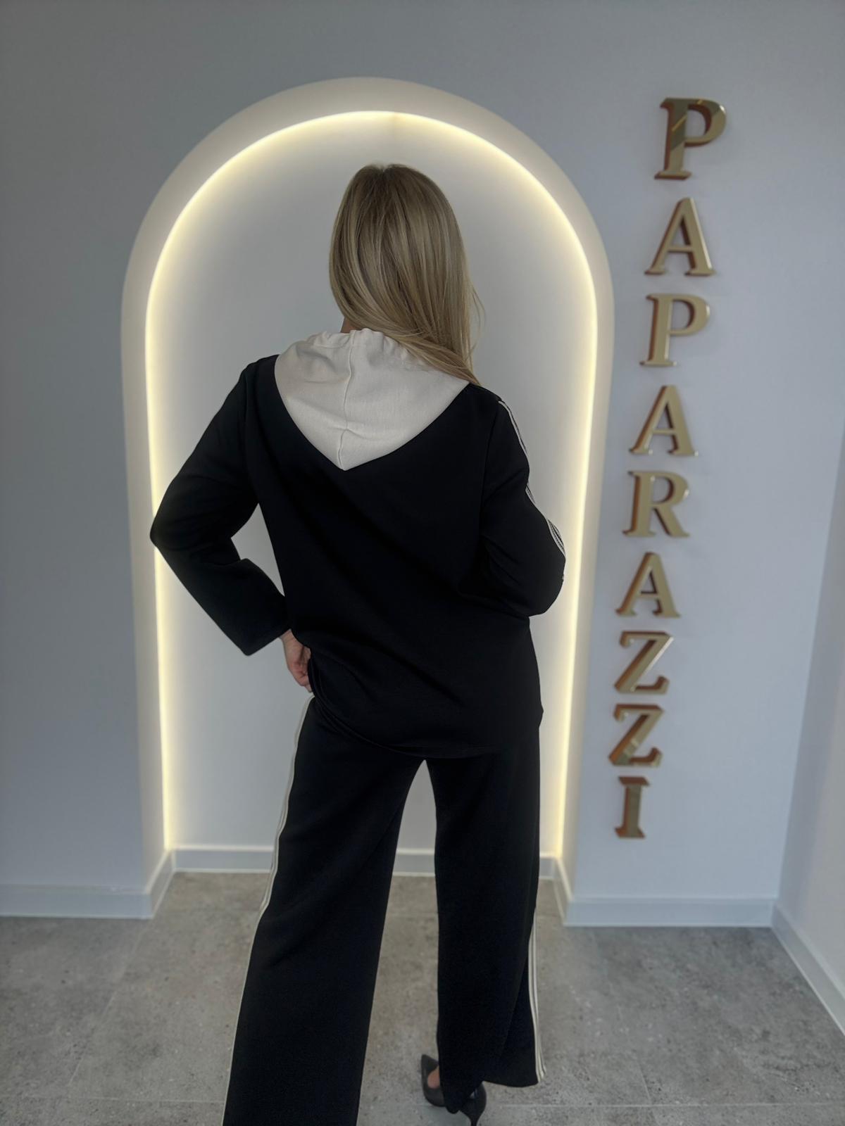 Sportowy garnitur z materiału „masełko” z lampasami po bokach oraz subtelnymi wstawkami panterkowymi. Spodnie o rozszerzanym kroju.