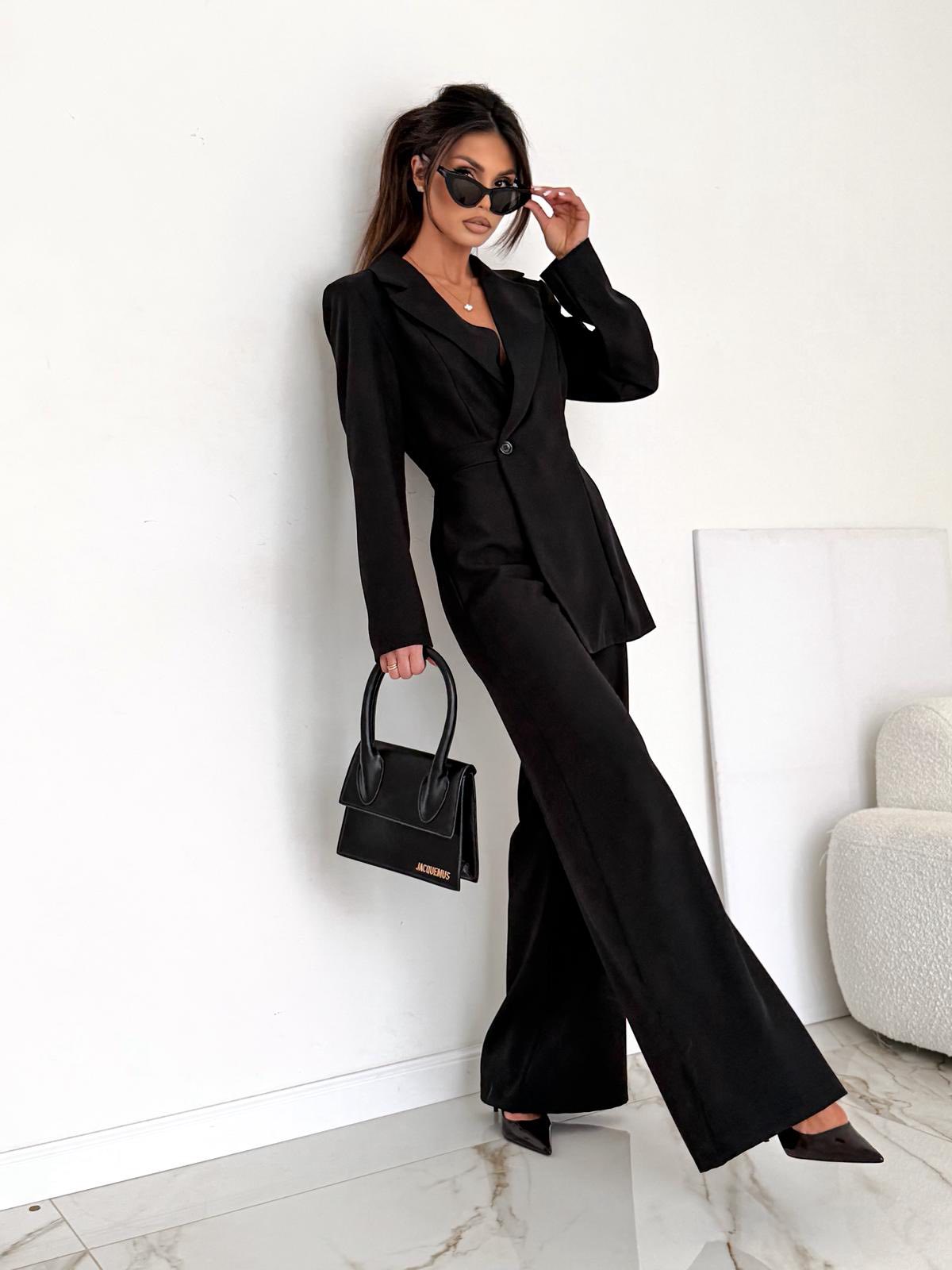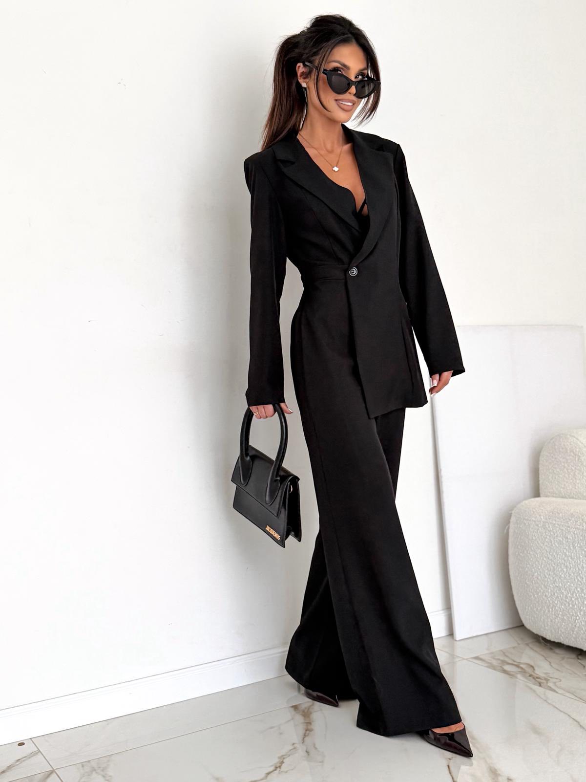 Wyjątkowy kombinezon w klasycznej czerni, który robi efekt „wow” bez wysiłku. Elegancki fason z podkreśloną talią i szeroką nogawką tworzy idealne proporcje i prezentuje się niezwykle kobieco. Doskonały wybór na wieczorne wyjścia, eventy i stylizacje premium.