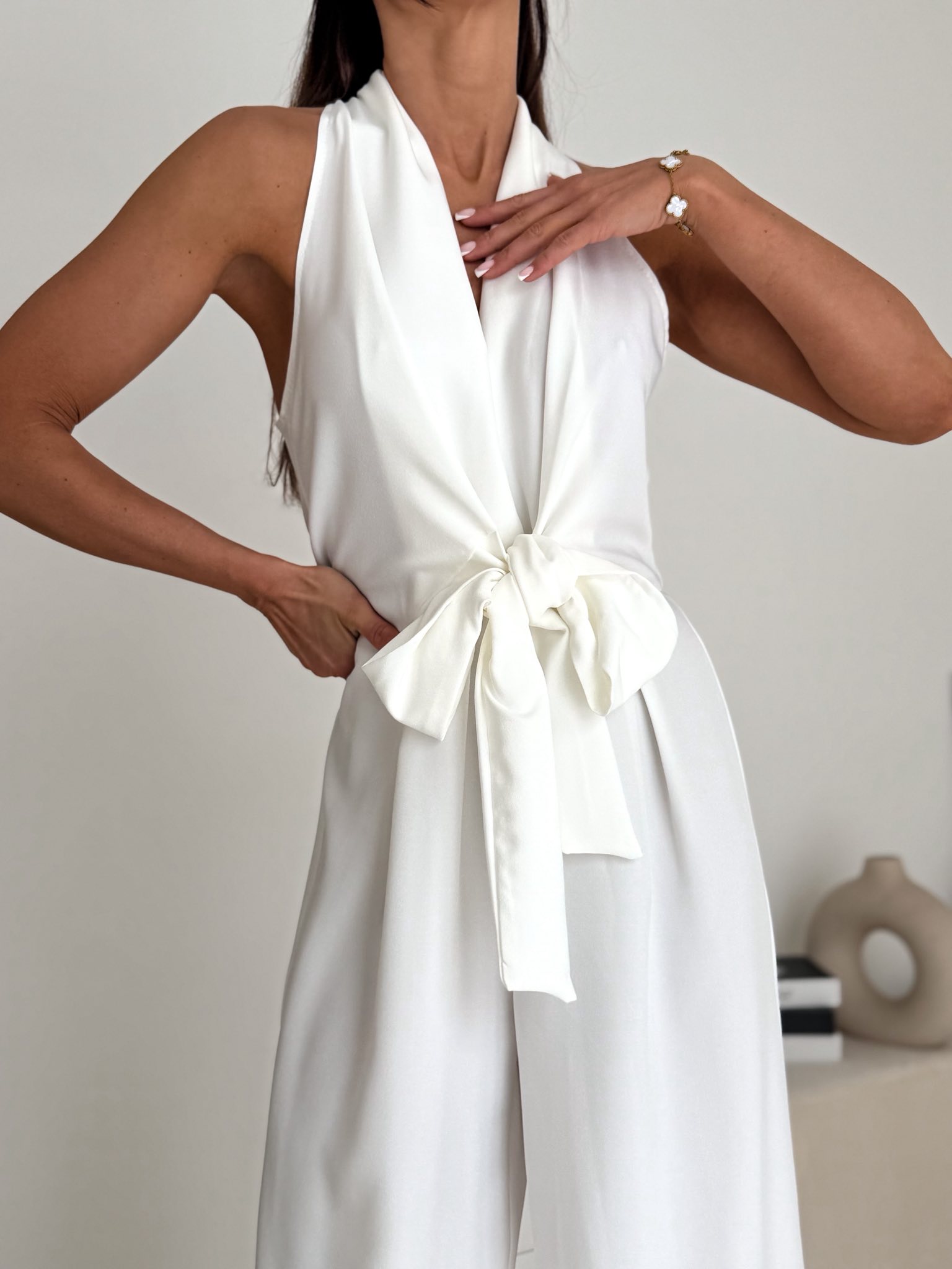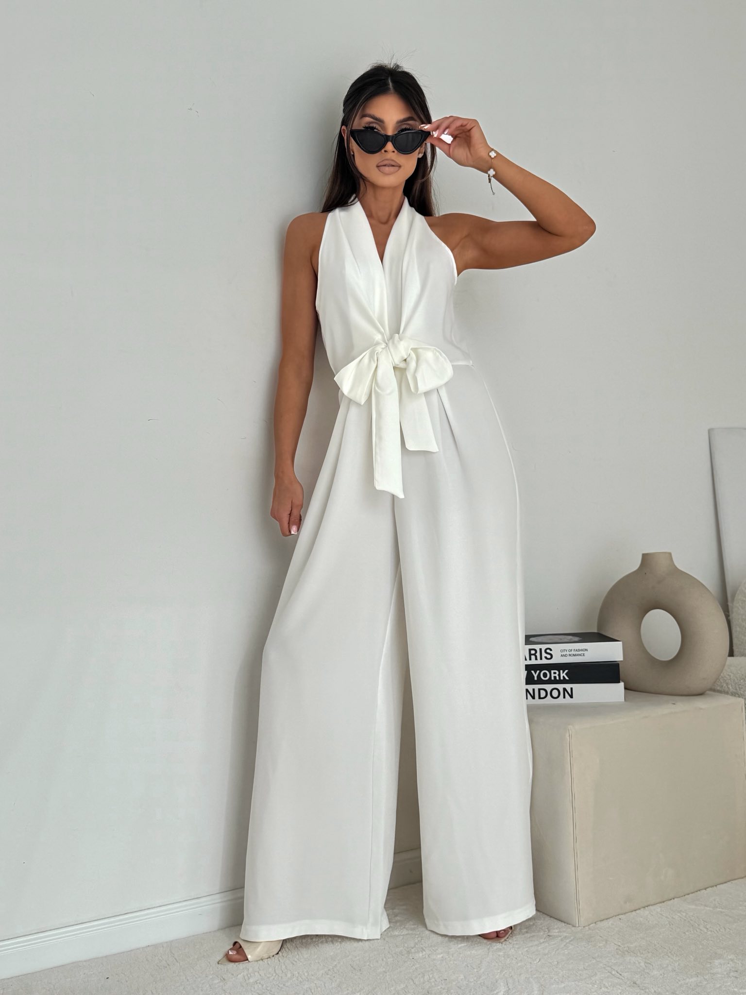 Kombinezon „Sahara Chic”- biały Elegancki, szeroki kombinezon z efektownym wiązaniem w talii w subtelnym, kremowo-beżowym odcieniu. Minimalistyczny krój i lejący materiał podkreślają sylwetkę, nadając stylizacji luksusowego i nowoczesnego charakteru. Idealny na wyjątkowe wyjścia, eventy oraz eleganckie spotkania.