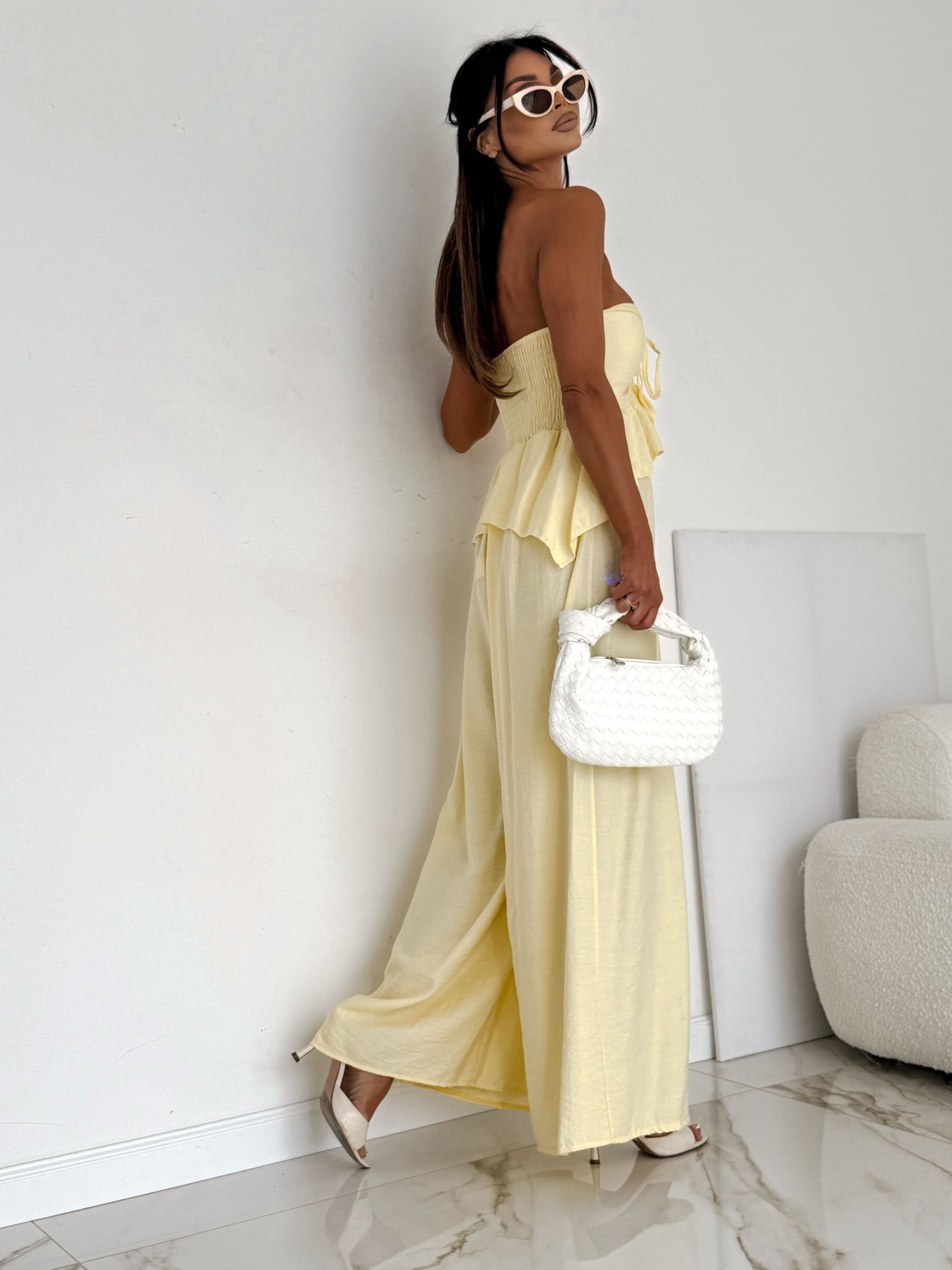 Lekki kombinezon w delikatnym żółtym odcieniu, który łączy wygodę z kobiecym stylem. Zwiewny materiał i szeroki krój sprawiają, że model idealnie wpisuje się w letnie stylizacje.