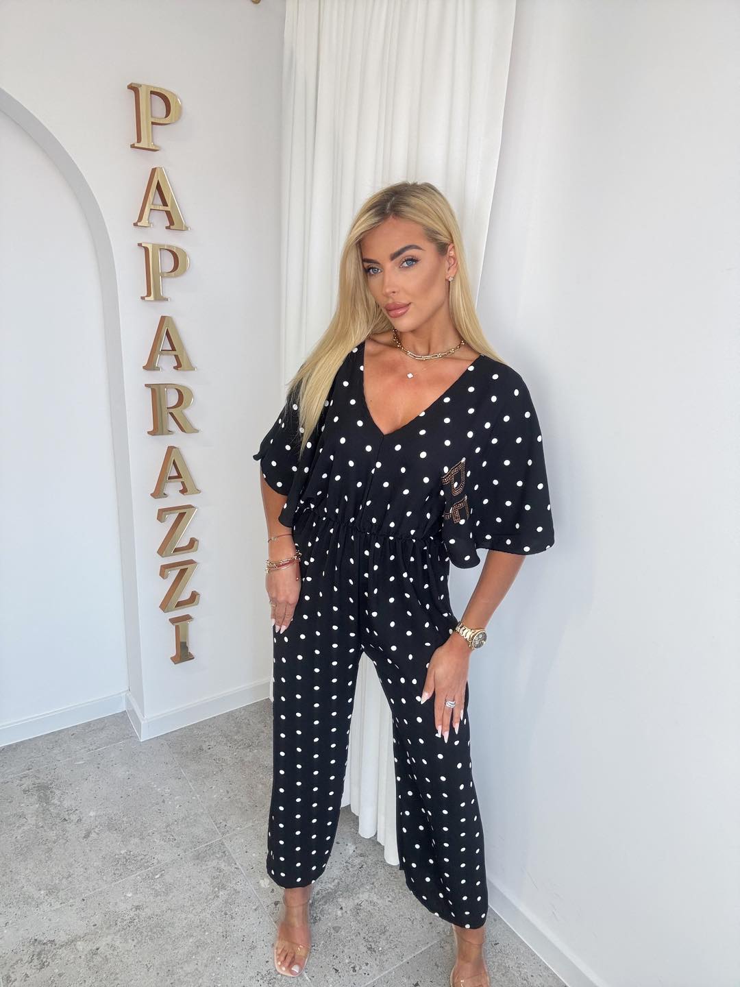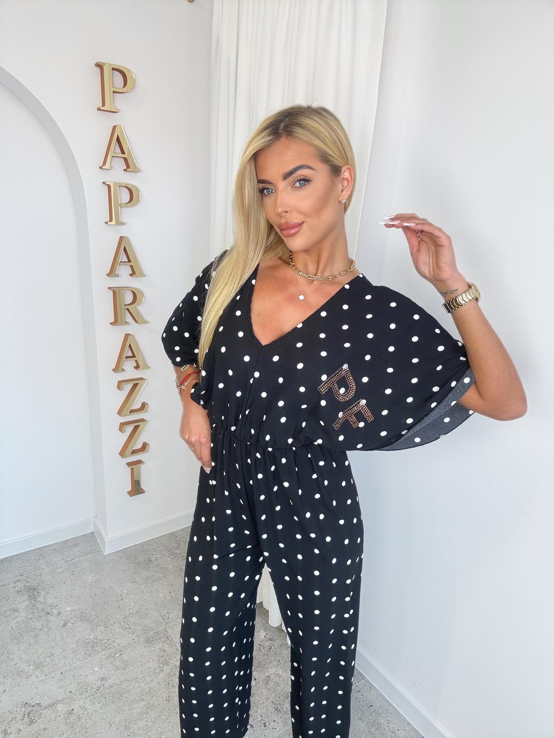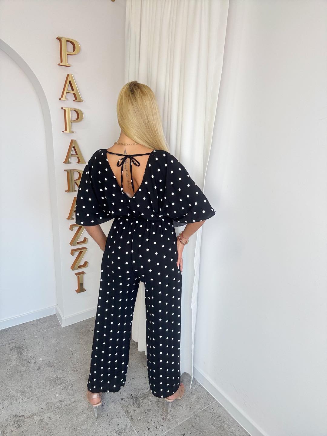 Kobiecy i niezwykle lekki kombinezon w głębokiej czerni z białymi groszkami. Model z gumeczką w pasie pięknie podkreśla talię, a szerokie, rozkloszowane rękawy nadają sylwetce lekkości i swobody.