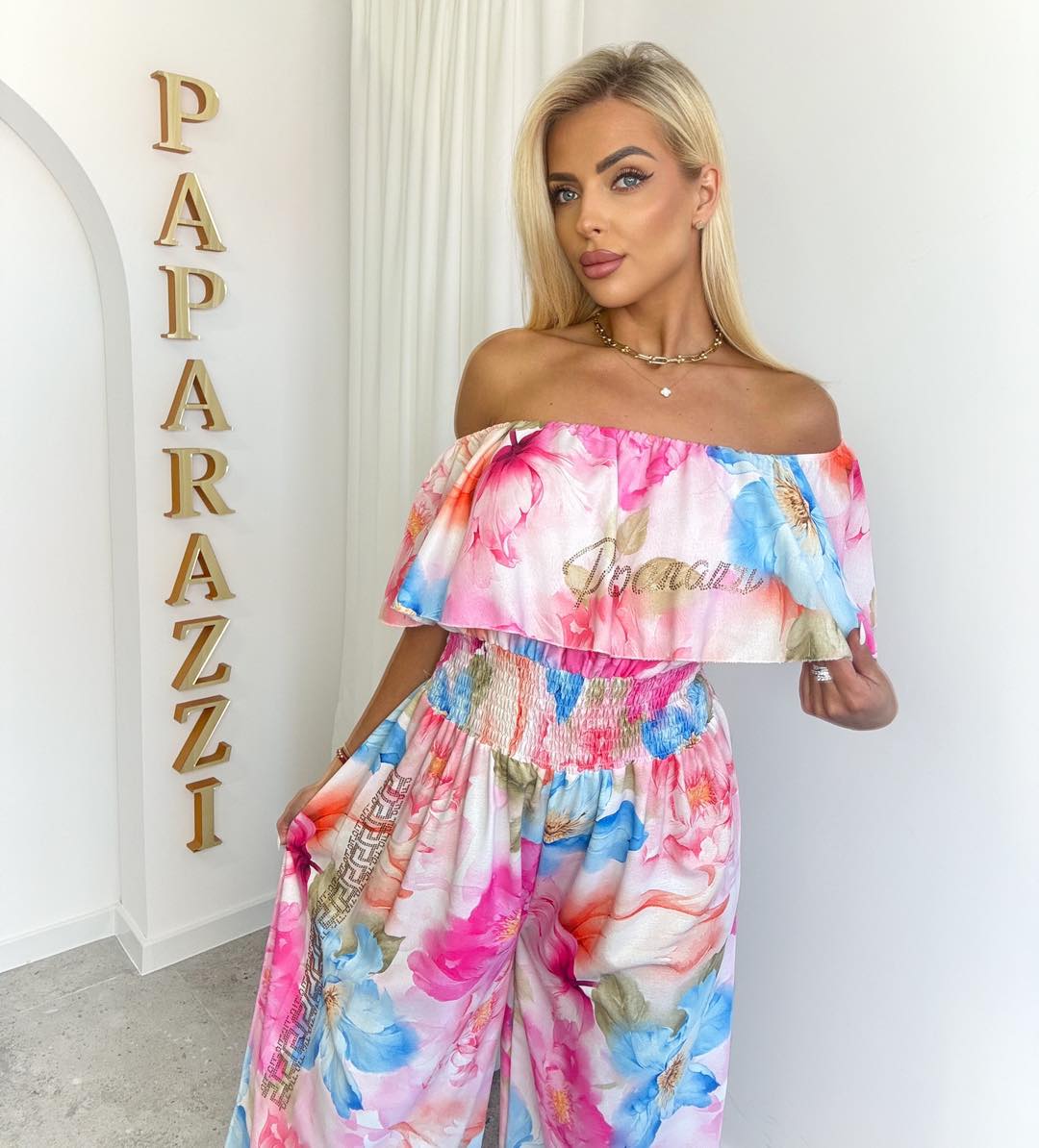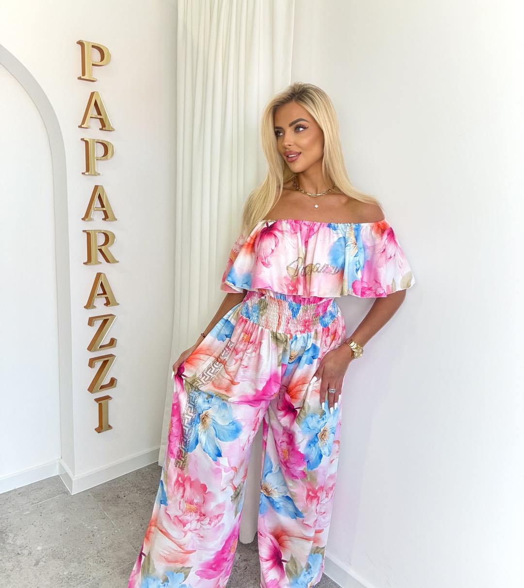Stylowy i niezwykle kobiecy kombinezon w kwiatowy wzór, który przyciąga spojrzenia i podkreśla sylwetkę. Model z odkrytymi ramionami i efektowną falbaną w górnej części dodaje lekkości oraz romantycznego charakteru. Elastyczna, marszczona talia idealnie dopasowuje się do figury, zapewniając komfort noszenia i piękne podkreślenie kształtów.