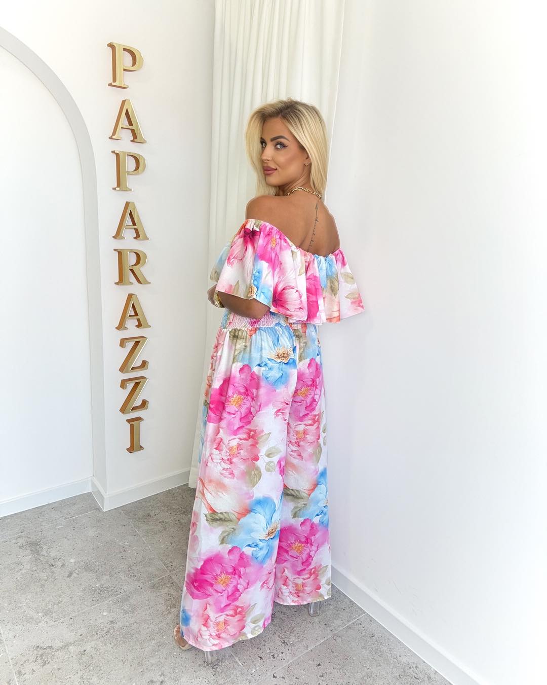 Stylowy i niezwykle kobiecy kombinezon w kwiatowy wzór, który przyciąga spojrzenia i podkreśla sylwetkę. Model z odkrytymi ramionami i efektowną falbaną w górnej części dodaje lekkości oraz romantycznego charakteru. Elastyczna, marszczona talia idealnie dopasowuje się do figury, zapewniając komfort noszenia i piękne podkreślenie kształtów. Szerokie nogawki gwarantują swobodę ruchów, a jednocześnie nadają całości eleganckiego, zwiewnego wyglądu. Wysokiej jakości materiał sprawia, że kombinezon świetnie układa się na ciele i doskonale sprawdzi się zarówno na letnie wyjścia, jak i specjalne okazje. To doskonały wybór dla kobiet, które cenią modę, wygodę i wyjątkowy styl w jednym. Rozmiar: Biust:x2 Pas:x2 Biodra:x2 Długość:cm