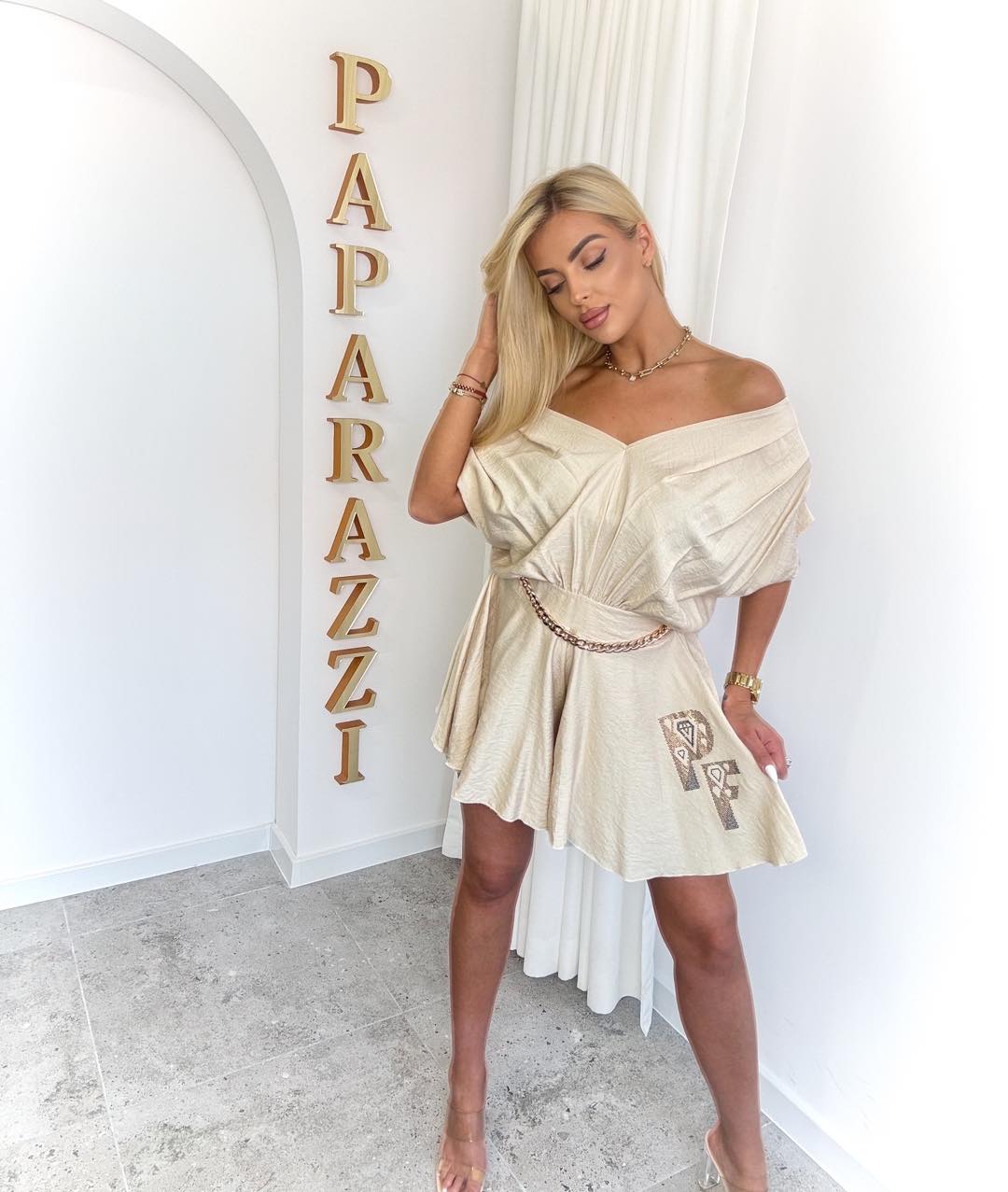 Stylowy, kobiecy kombinezon w subtelnym, beżowym odcieniu, który łączy elegancję z wygodą. Góra o kopertowym kroju pięknie podkreśla dekolt, a luźniejsze rękawy dodają lekkości i swobodnego charakteru. Talia została zaakcentowana delikatnym paskiem, który modeluje sylwetkę i podkreśla kobiece proporcje. Rozkloszowany dół przypominający spódniczkę nadaje całości wyjątkowego uroku i sprawia, że kombinezon prezentuje się niezwykle efektownie w ruchu. Lekki, przewiewny materiał sprawia, że to idealny wybór na ciepłe dni, letnie wyjścia czy specjalne okazje. Biust:55×2 Pas:35-45×2 Biodra:80×2 Długość:88cm