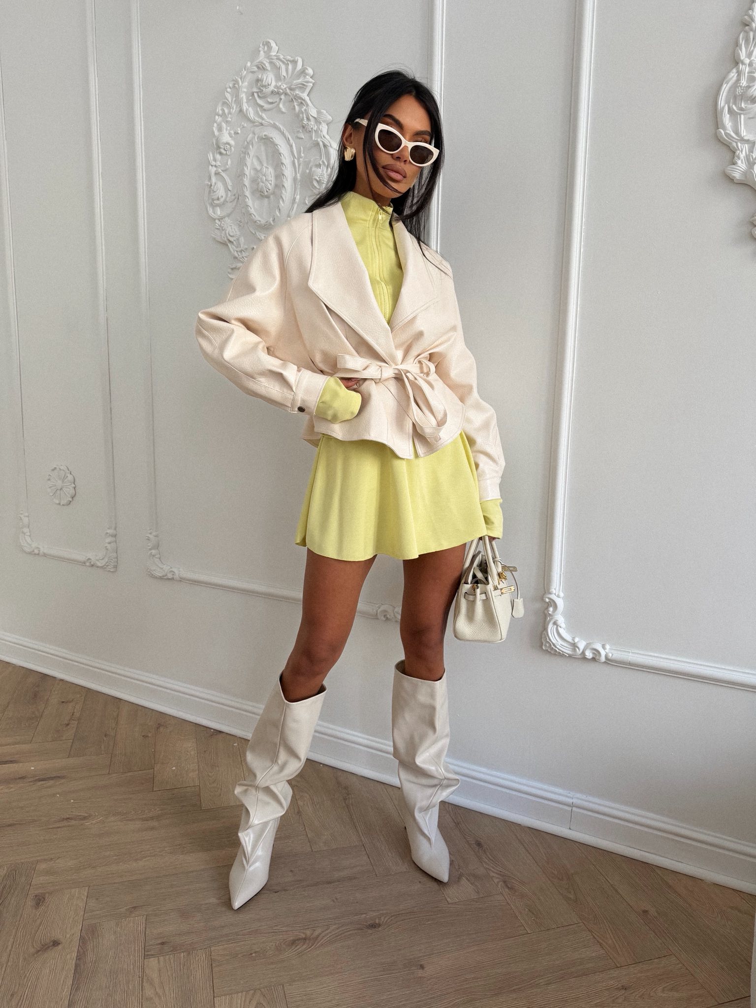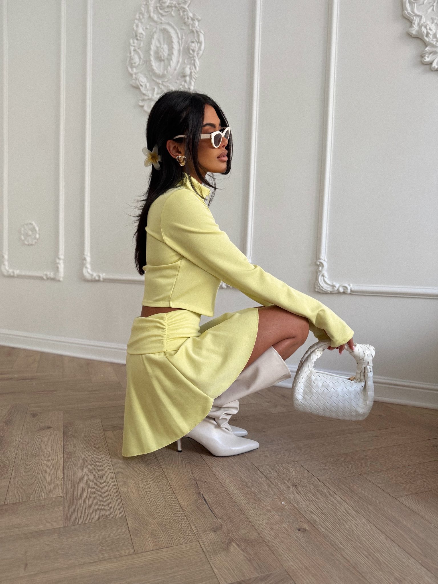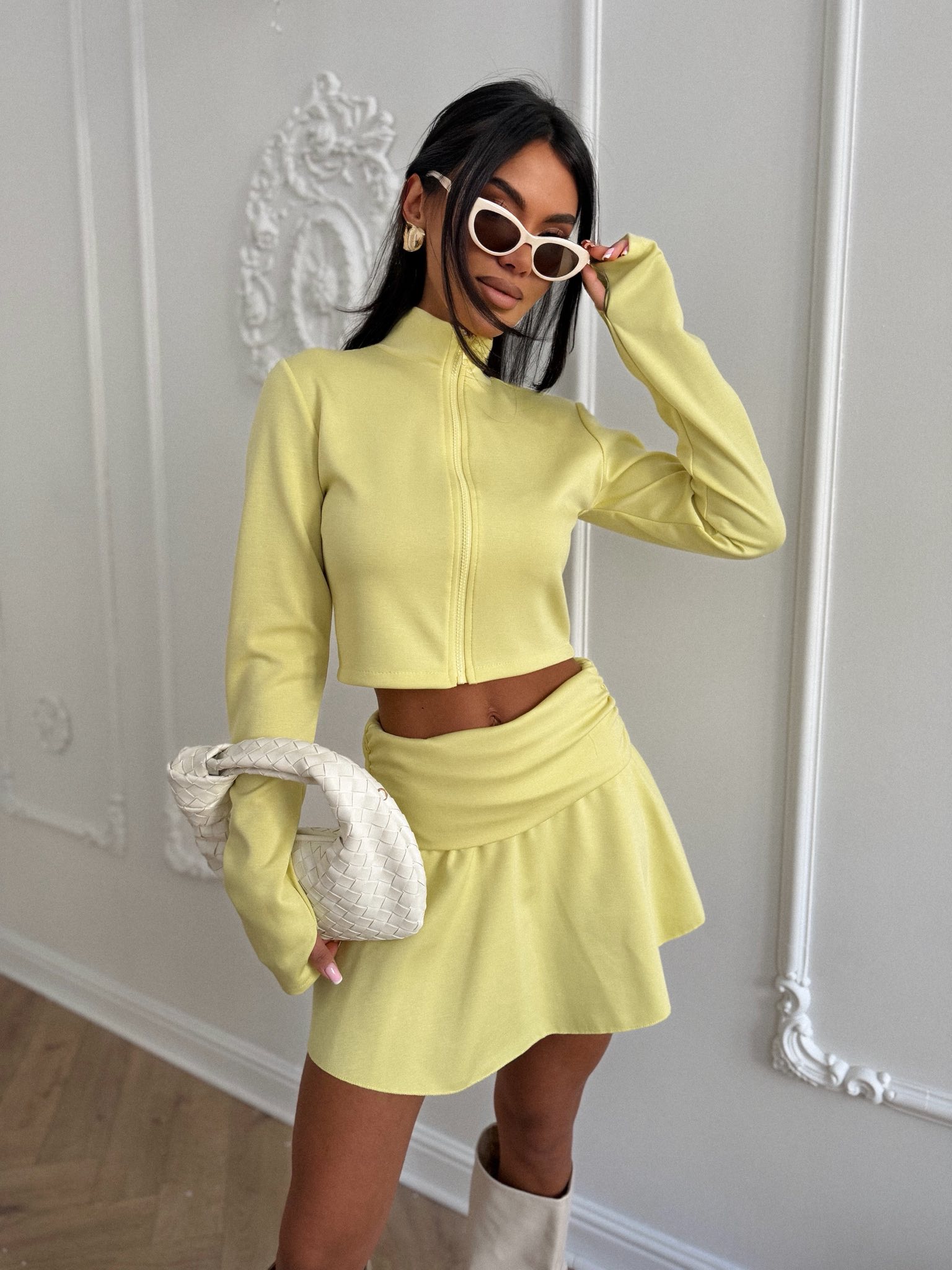 Energetyczny komplet w modnym, limonkowym kolorze, który przyciąga spojrzenia i ożywia każdą stylizację. Bluza na zamek i spódniczko-szorty tworzą wygodny, a jednocześnie bardzo stylowy zestaw na wiosnę i lato.