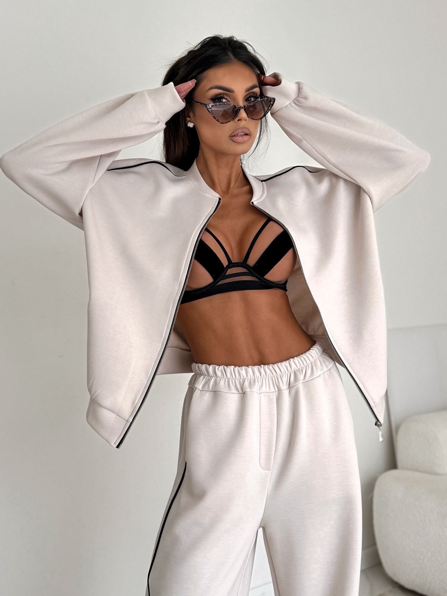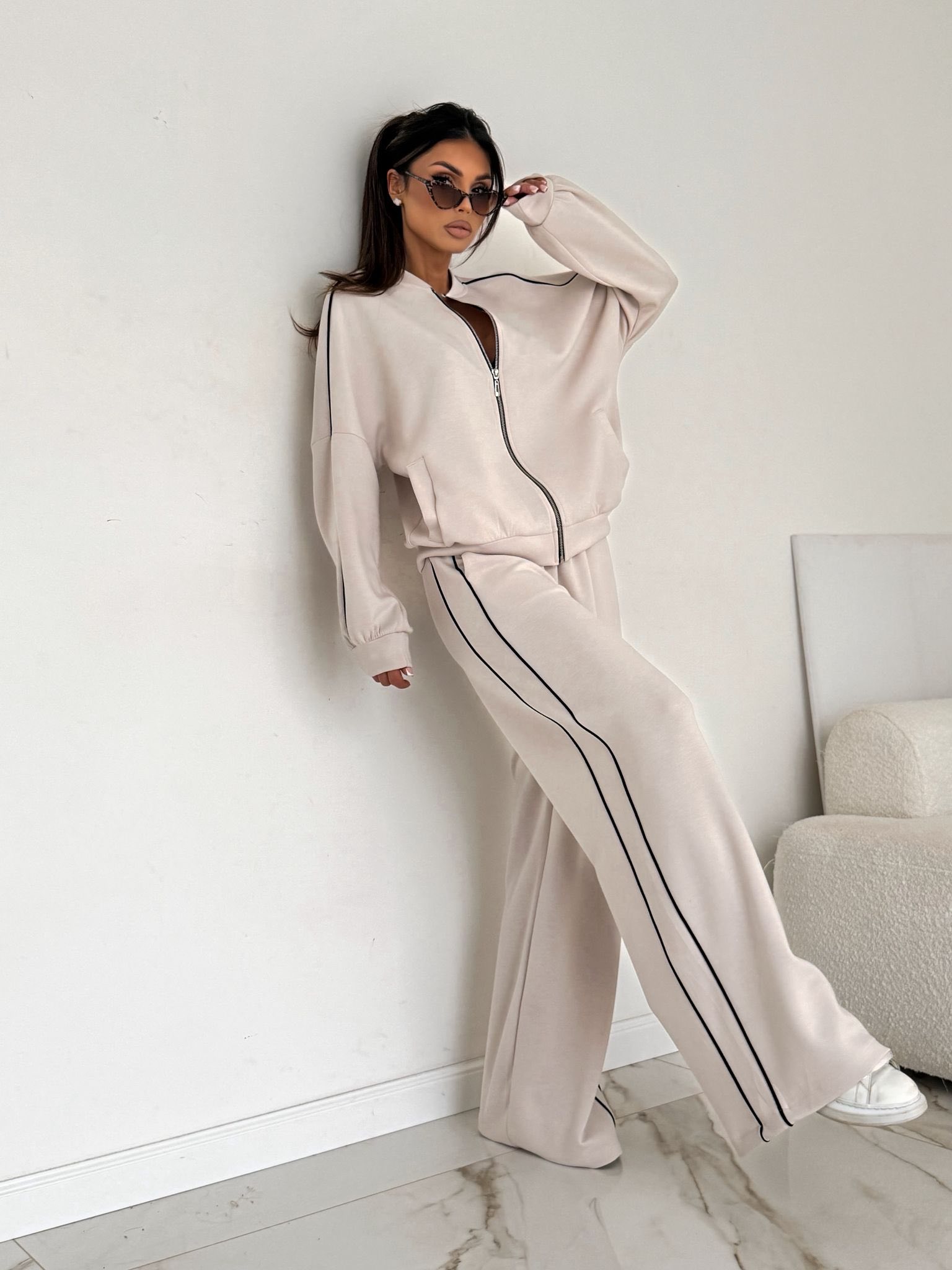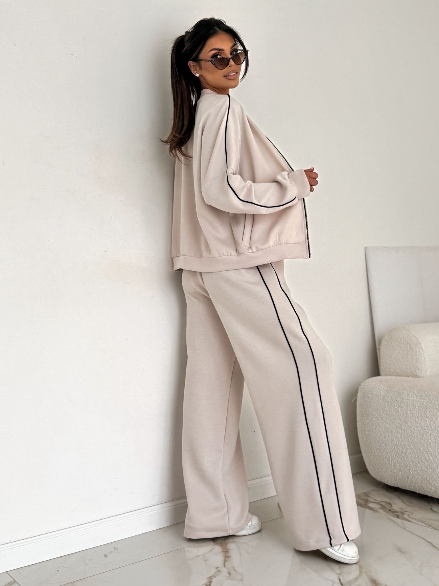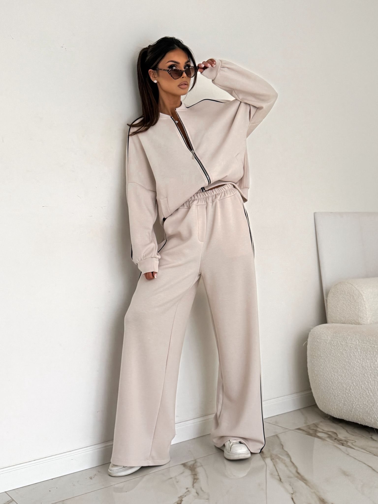 Nowoczesny komplet z rozpinaną bluzą na suwak i subtelnymi, kontrastowymi lamówkami po bokach. Szerokie spodnie z elastyczną talią nadają sylwetce lekkości i zapewniają maksymalny komfort noszenia. Komplet w rozmiarze uniwersalnym, wykonany w 95% z bawełny.