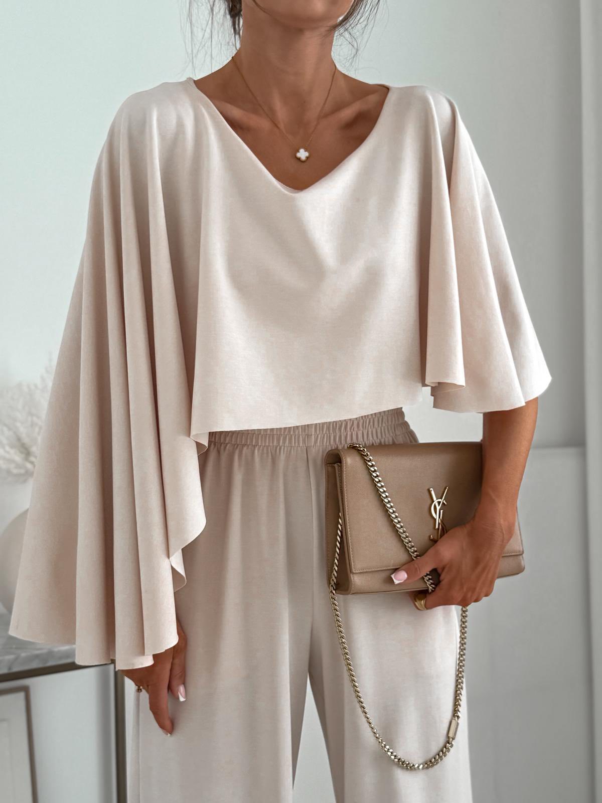 Elegancki komplet składający się z efektownego body z szeroką, asymetryczną narzutką oraz spodni z szeroką nogawką 🤍 Lekki, płynny fason pięknie układa się na sylwetce, a całość tworzy wyjątkowo kobiecą i nowoczesną stylizację. Idealny na eleganckie wyjścia, uroczystości i stylizacje premium.