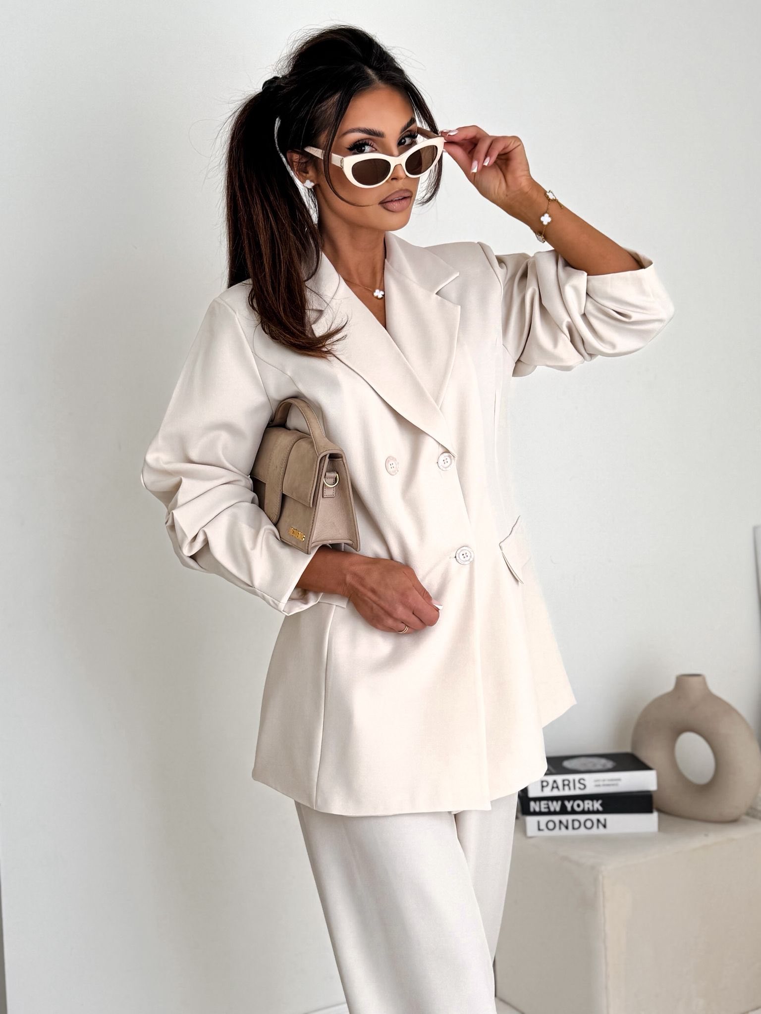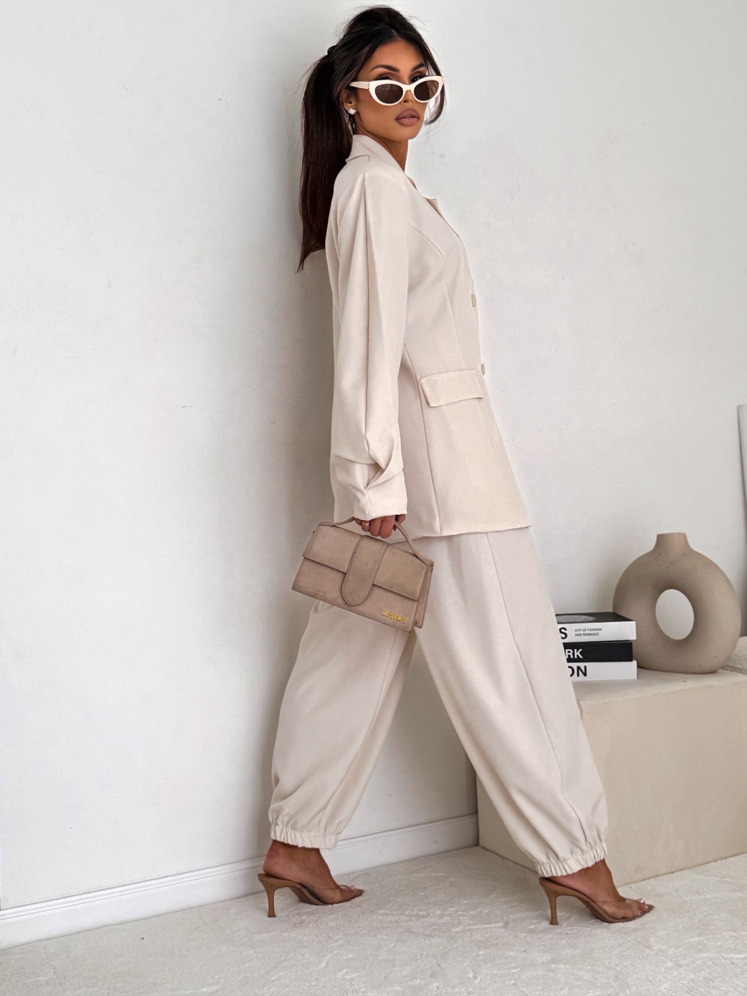 Komplet „Beige Elegance”- jasny beż Stylowy komplet składający się z luźniejszej marynarki o klasycznym kroju oraz wygodnych spodni z delikatnym ściągaczem przy kostce. Minimalistyczna forma i ponadczasowy fason …