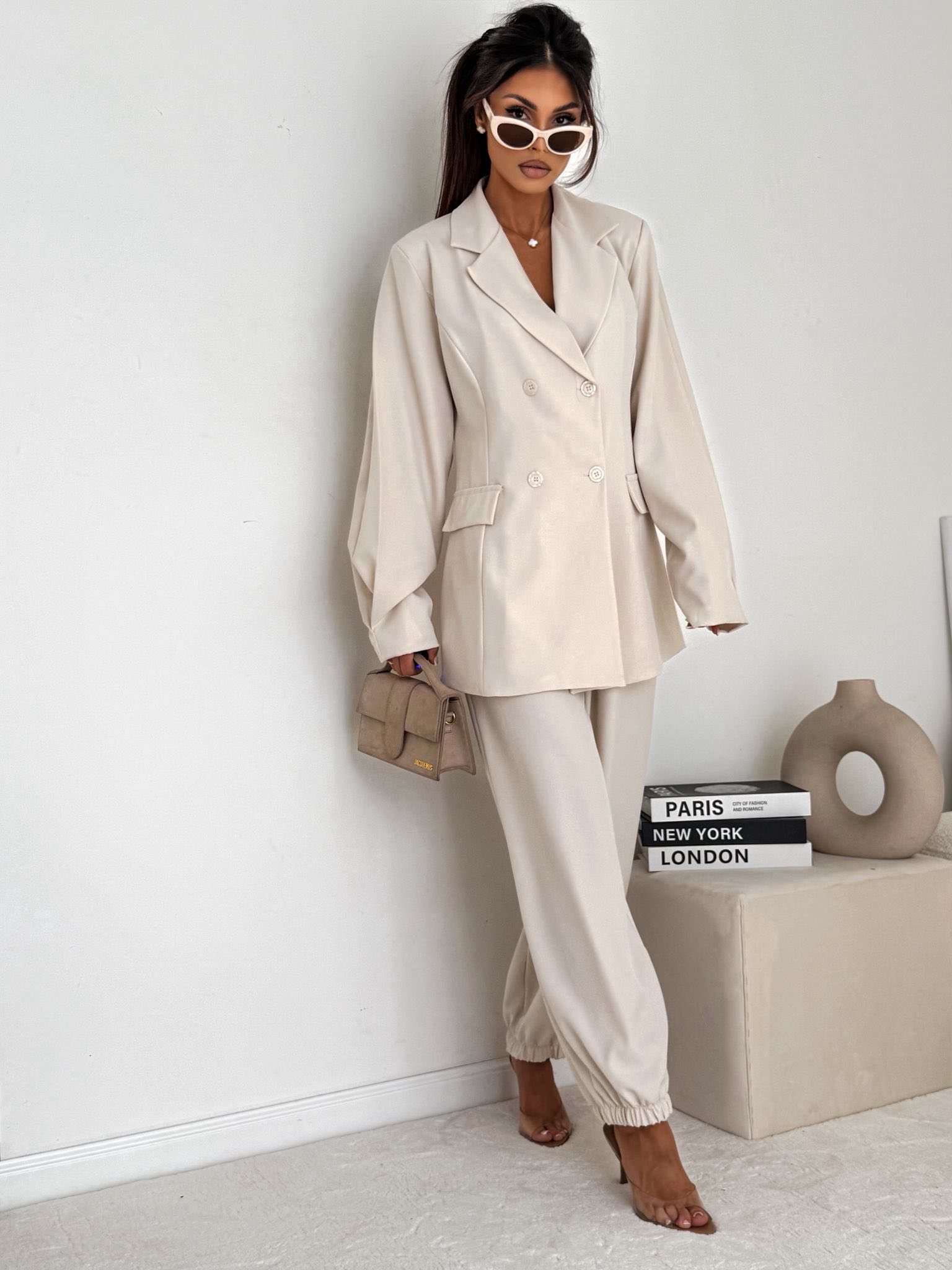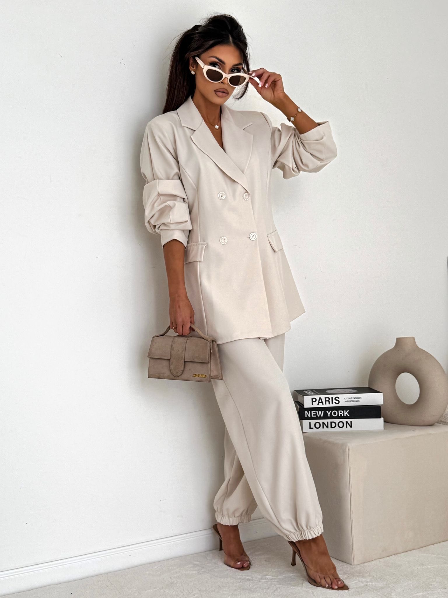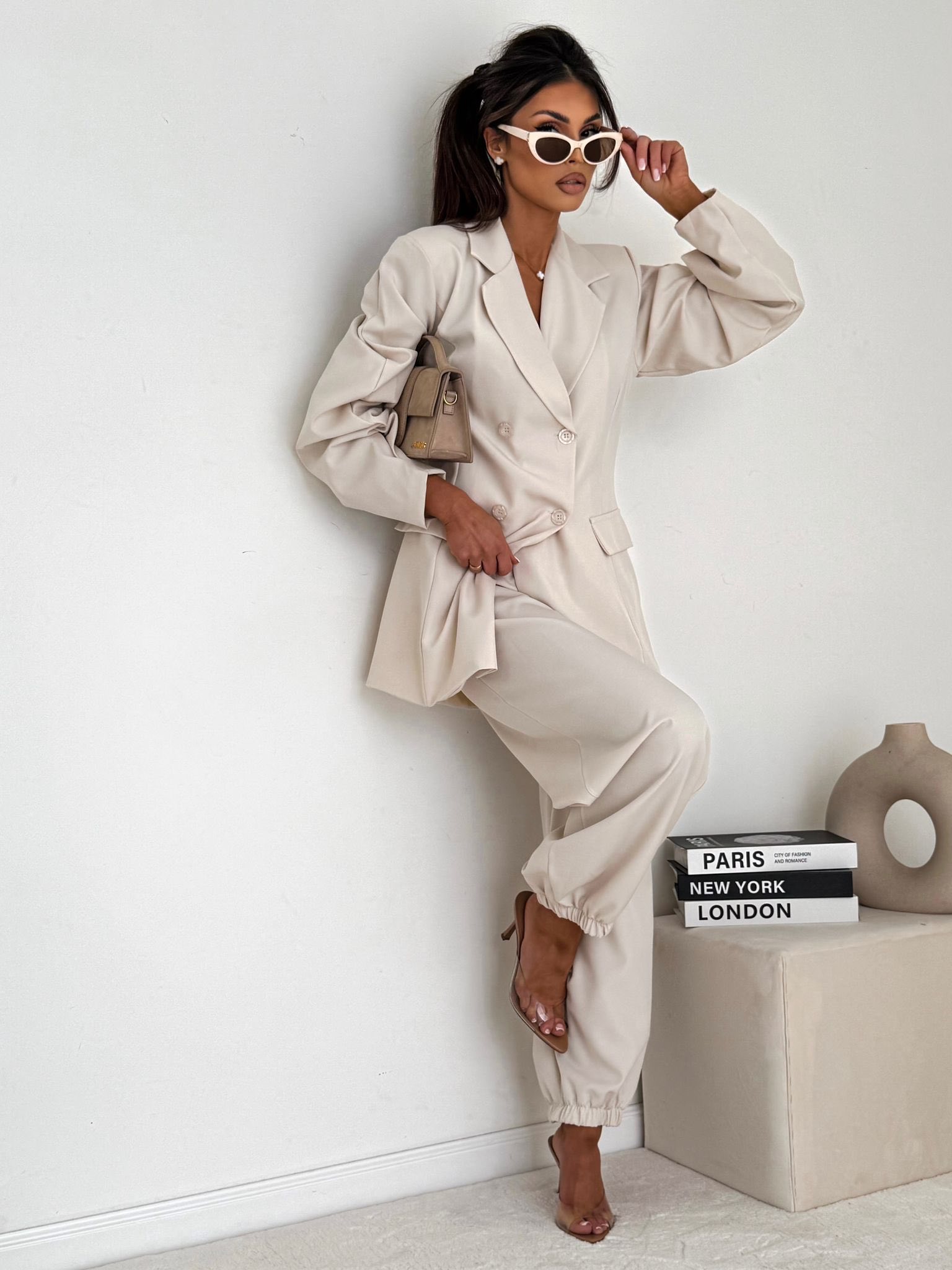 Stylowy komplet składający się z luźniejszej marynarki o klasycznym kroju oraz wygodnych spodni z delikatnym ściągaczem przy kostce. Minimalistyczna forma i ponadczasowy fason nadają całości szykownego, nowoczesnego charakteru. Idealna propozycja zarówno do eleganckich stylizacji, jak i modnych, codziennych zestawów.