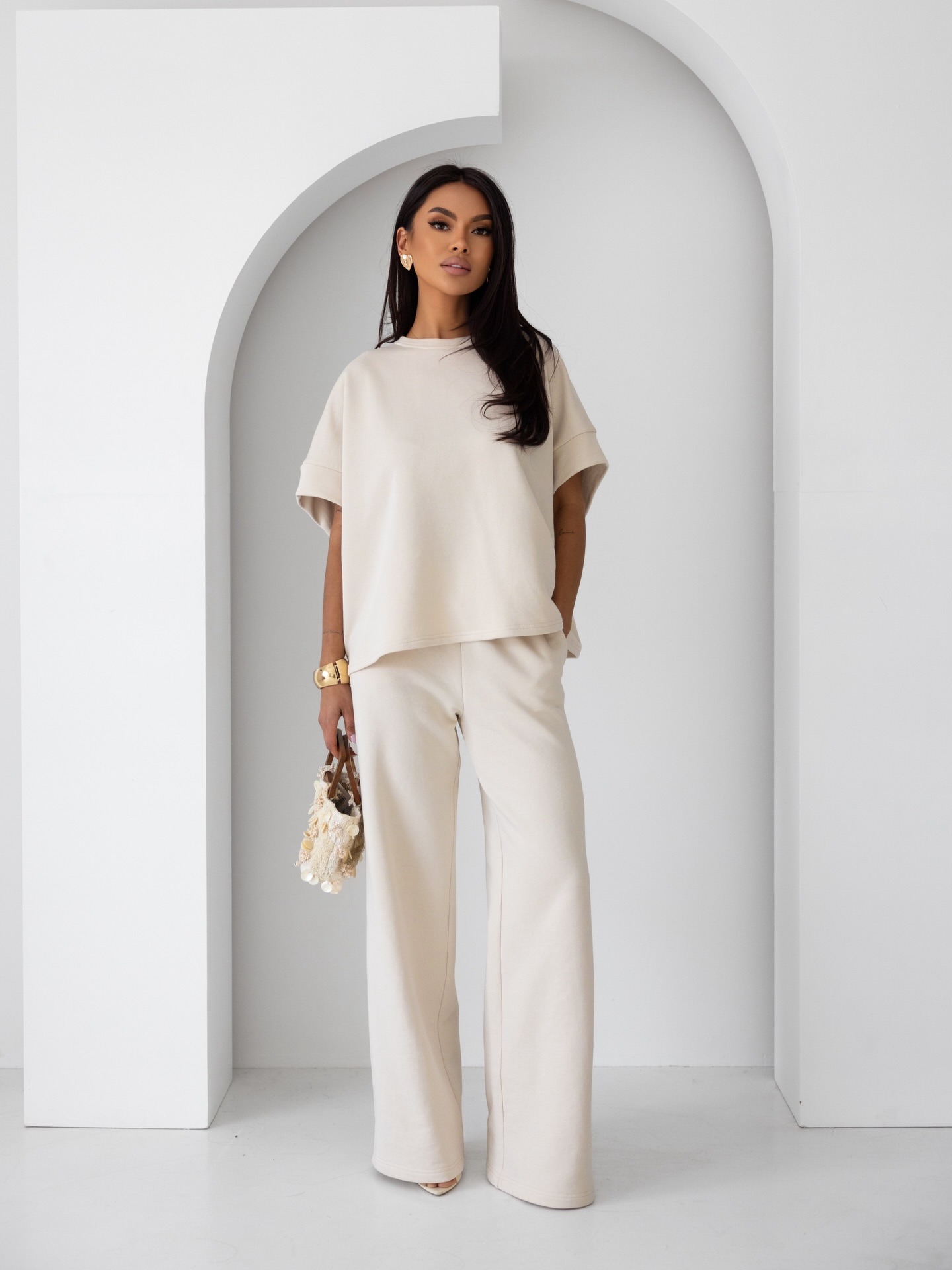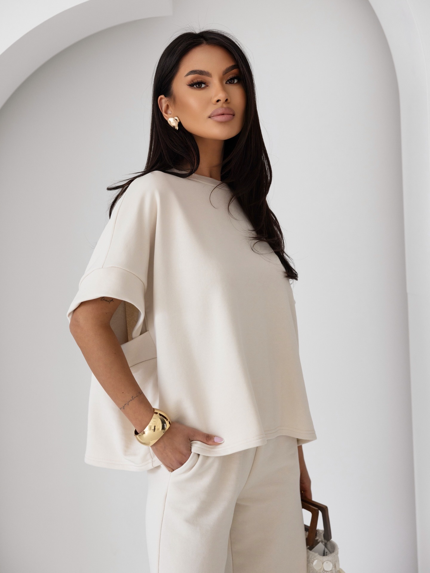 Luźna, oversize’owa góra z krótkim rękawem, który pięknie układa się na sylwetce, a szerokie spodnie z wysokim stanem wydłużają nogi i dodają lekkości całej stylizacji.