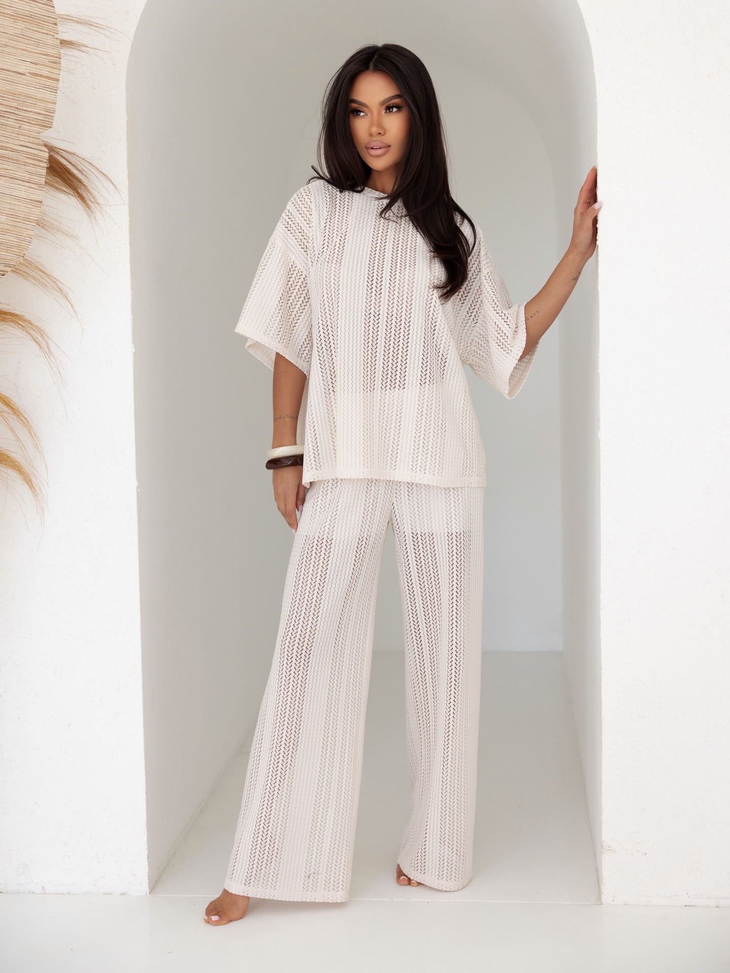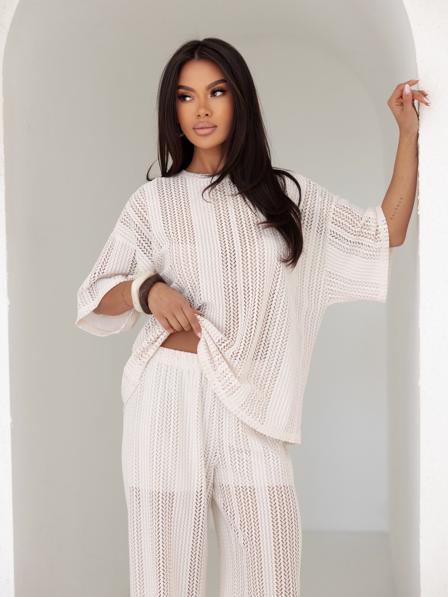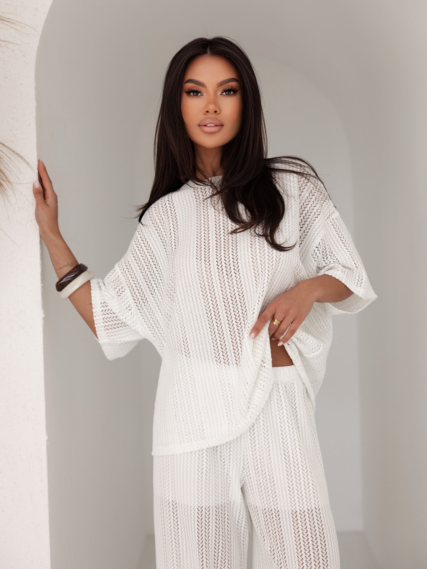 Oversize’owa bluzka z krótkim rękawem i szerokie spodnie tworzą swobodny, ale niezwykle efektowny look. Delikatna, przewiewna tkanina pięknie pracuje w ruchu, odsłaniając skórę w bardzo kobiecy, nienachalny sposób.
