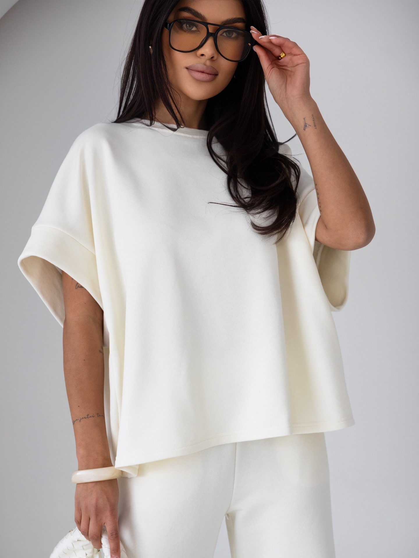 Luźna, oversize’owa góra z krótkim rękawem, który pięknie układa się na sylwetce, a szerokie spodnie z wysokim stanem wydłużają nogi i dodają lekkości całej stylizacji.