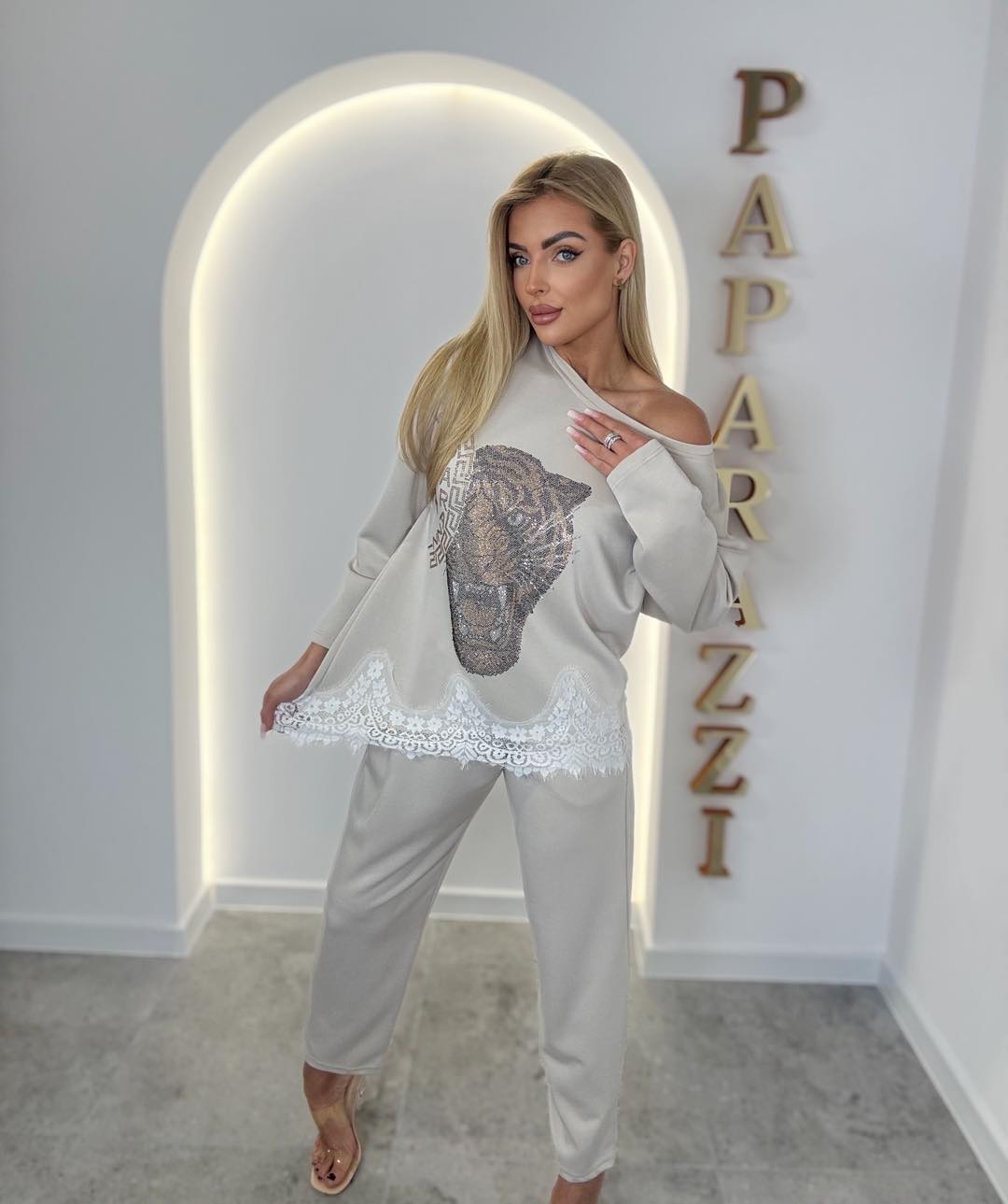 Bluzeczka ze złotym tygrysem zakończona piękną koronką. Proste klasyczne spodnie w komplecie. Rozmiar: Bluza: Biust:65x2 Pas:62x2 Długość: 70/90cm Spodnie: Pas:35-55x2 Biodra:66x2 …