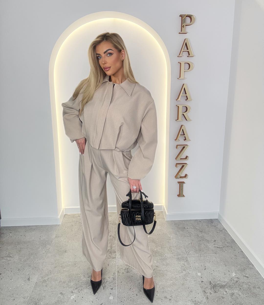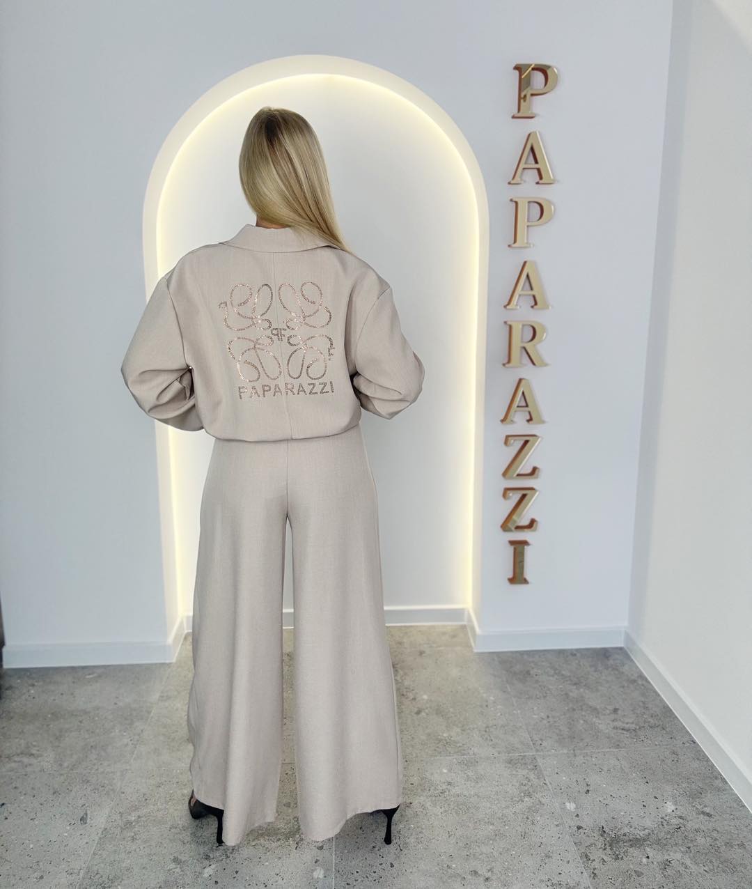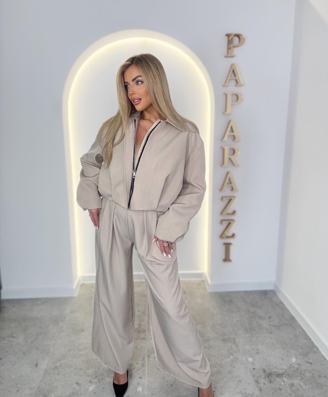 Bluza/kurteczka zapinana na zamek z kołnierzykiem ze złotym zdobieniem na placach. Spodnie z ozdobnymi kontrafałdami i rozszerzonym kroju.