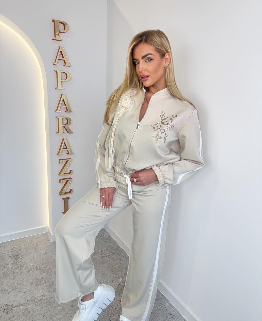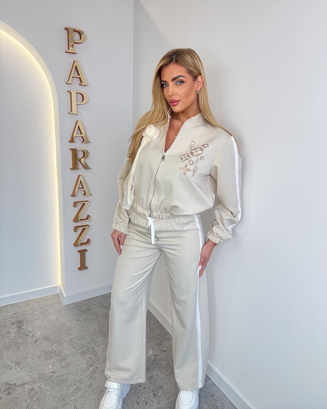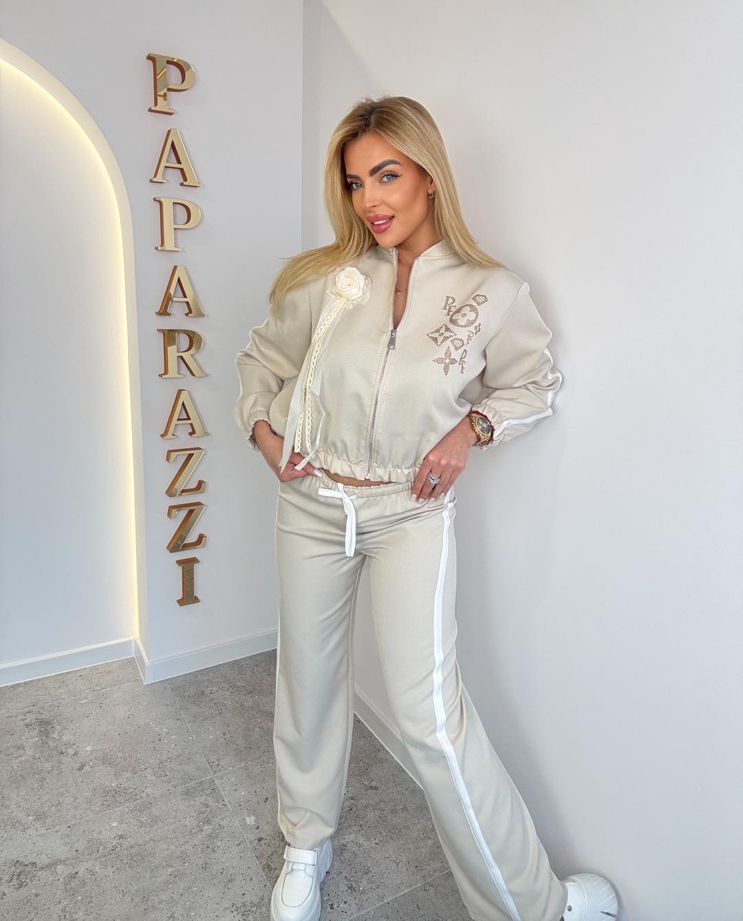 Bluza zapinana na zamek ze stójką, złotą dekoracją oraz ozdobną różyczką. Spodnie lekko rozszerzane z lampasem po bokach.
