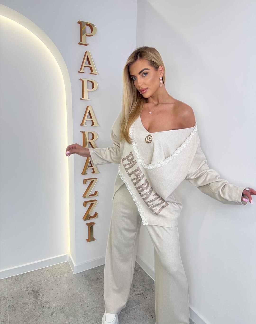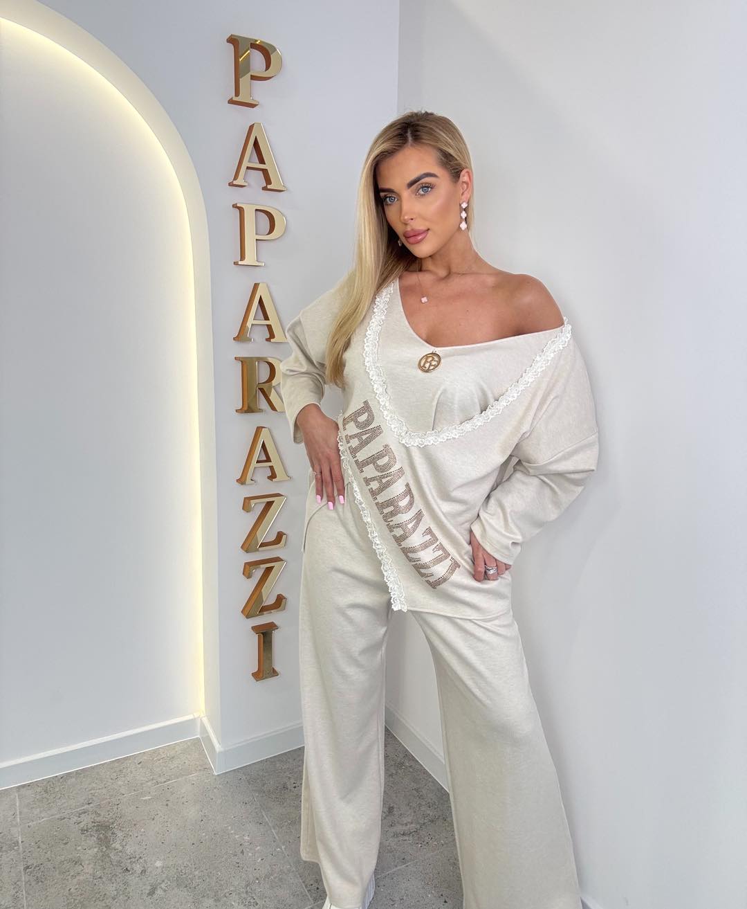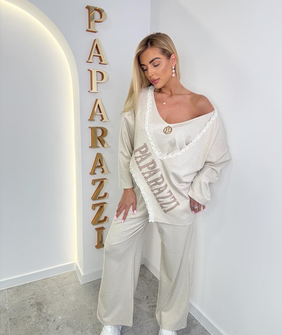 Komplet dzianinowy z asymetryczną bluzą wykończoną koronką. Spodnie o luźnym, swobodnym kroju. Bluzka: Biust:70-80x2 Pas:62-75x2 Długość: 71cm Spodnie: Pas:33-65x2 Biodra:60-75x2 Długość:109cm