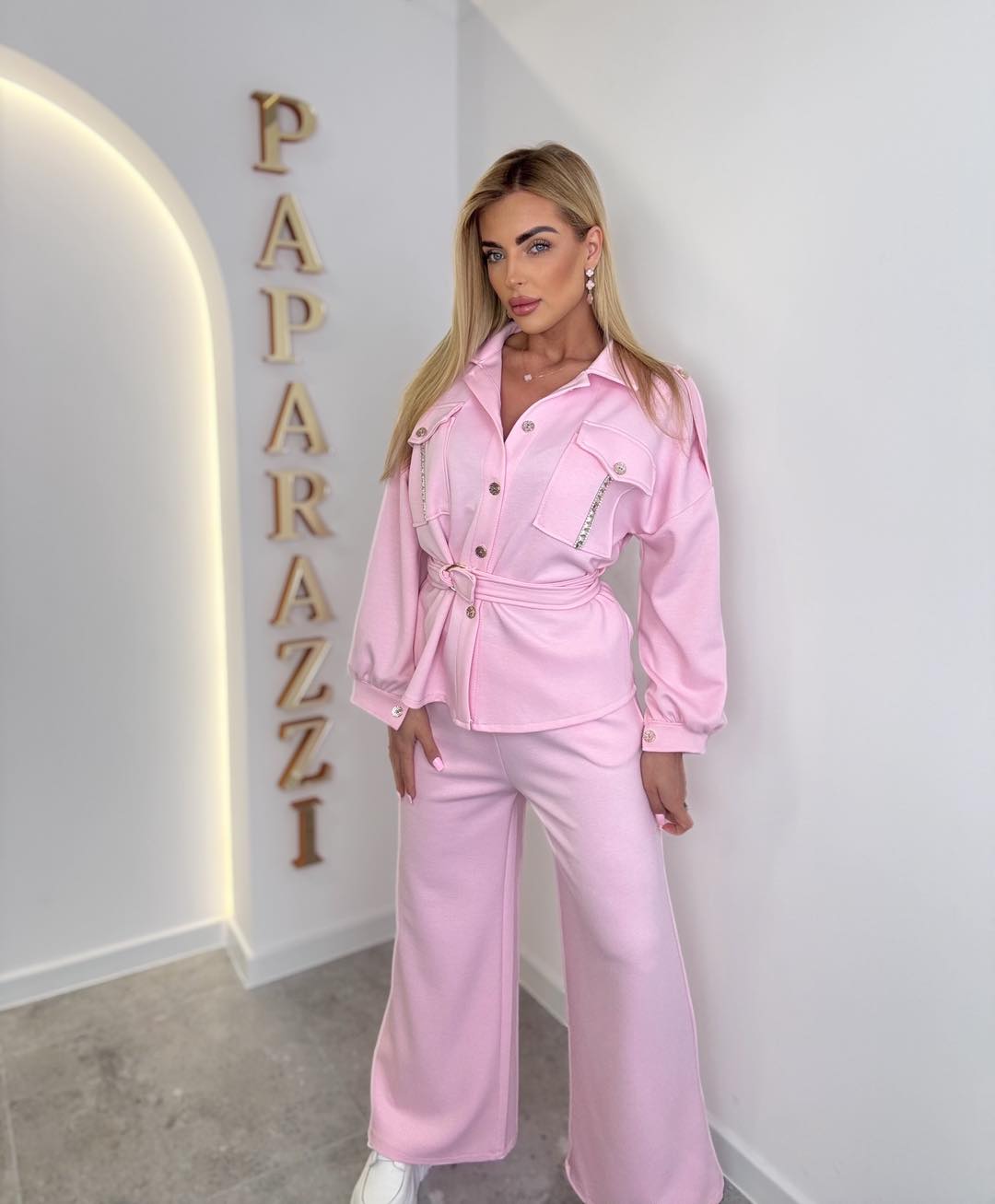 Komplet z materiału typu „masełko” z bluzą zapinana na guziczki i ozdobnymi kieszeniami. Spodnie o rozszerzanym kroju.